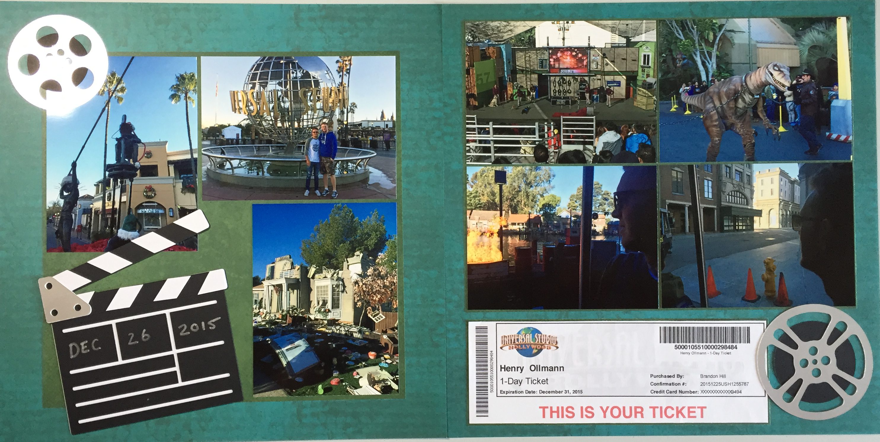 This is the second spread from our day at Universal Studios Hollywood. I continued the green theme onto this page from the first page. This page highlights pictures from the “movie” part of the park including pictures from the Park entrance, the Studio Tour, the Animal Actor’s show, and the Jurassic Park area.