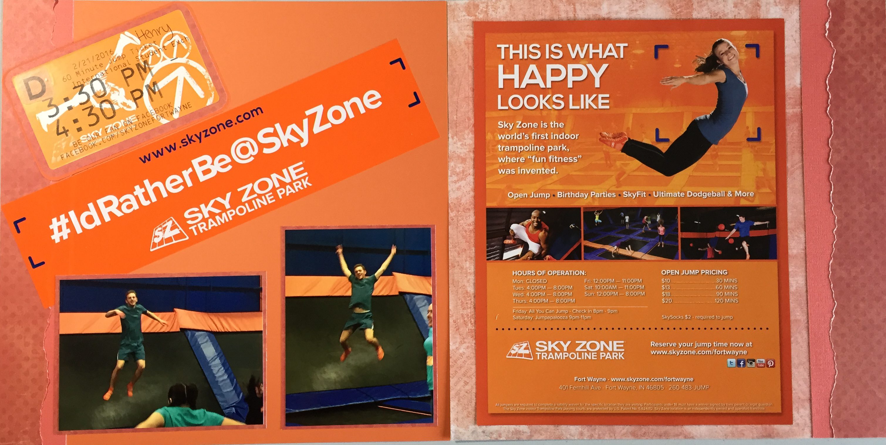 We stated our new year of fun things by going to SkyZone – which is an indoor trampoline park – a perfect way to get out energy during a long, cold winter. The colors of Skyzone are orange and blue and so that is the color scheme that you see reflected throughout this spread. Besides the obligatory pictures of flying through the air, the ephemera that I included on this page are a bumper sticker, sales brochure, and the entrance ticket. I like to use ticket stubs on my pages at they often help to establish the date of the activity. What I like about this one is that it also shows the exact time frame that we were there as well.