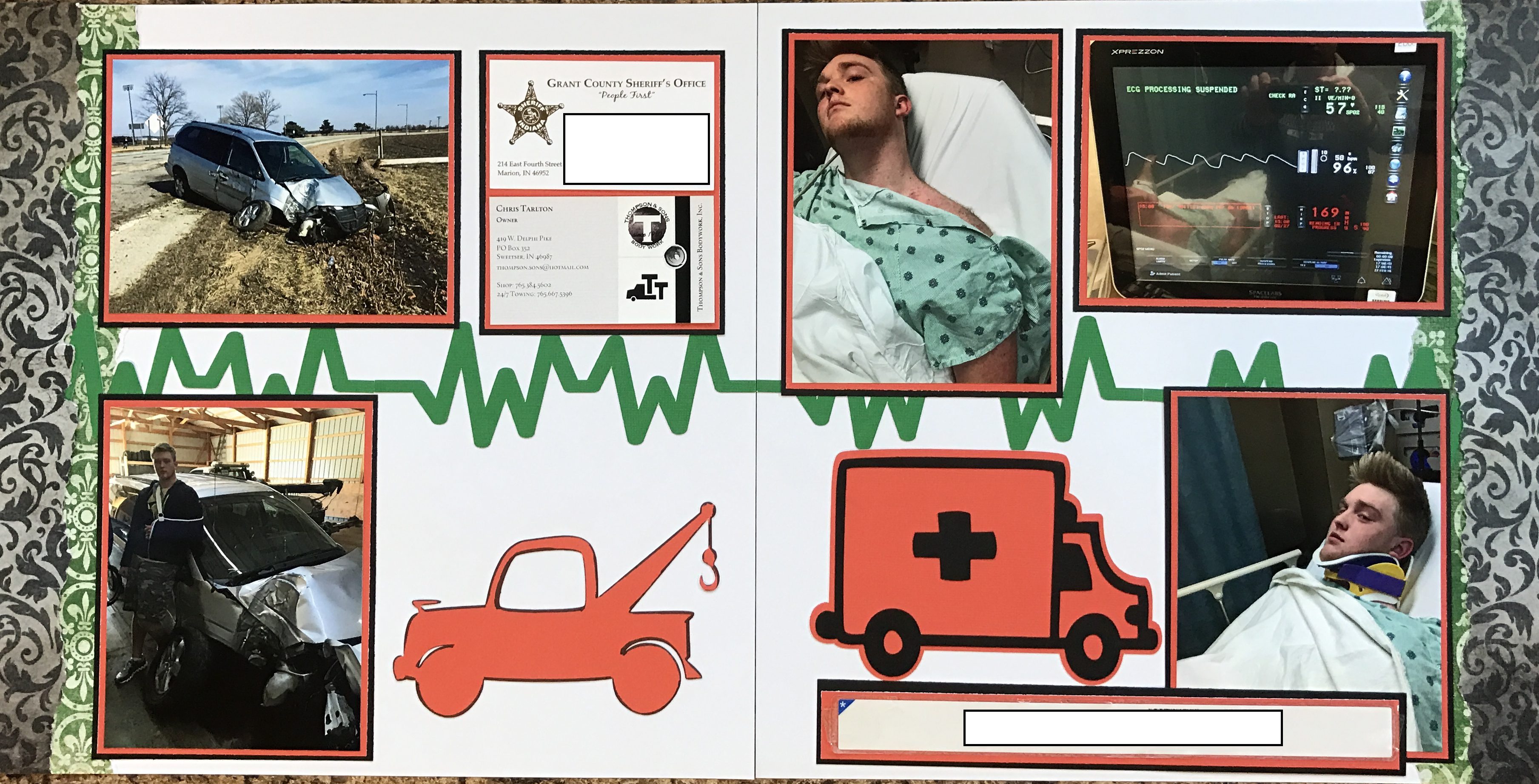 I know that not many people would want to make a scrapbook page about an accident – but – this is a webpage for scrapbooking for and by men – and men often view surviving a wreck as masculine – so here we go! (Note – there must be others who scrapbook about emergencies because you can buy a scrapbook kit for the ER (See below).