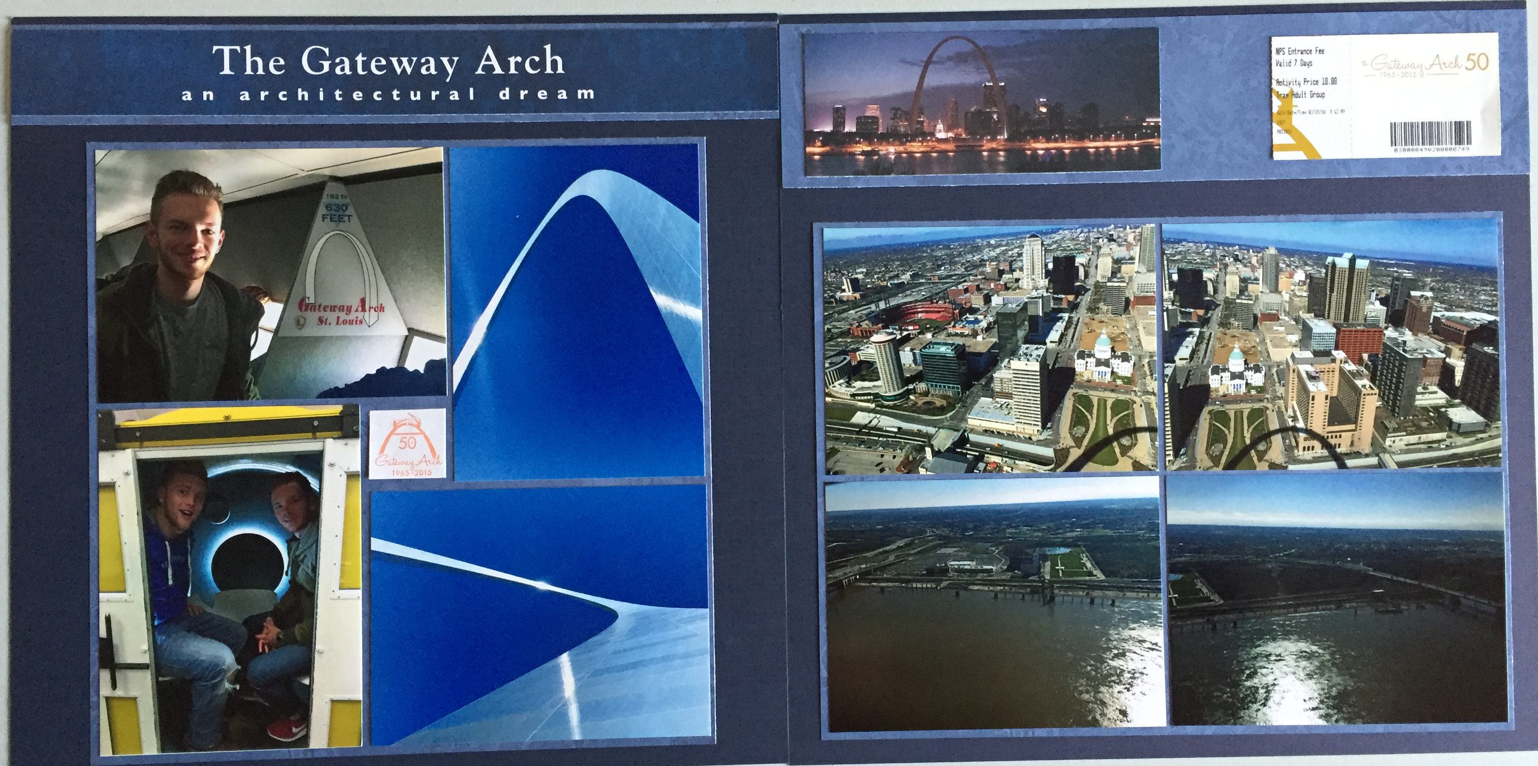 I chose a blue theme for this page to play off of the beautiful blue in the pictures looking up at the arch. The left hand page has a date stamp from the museum in the middle of the pictures, which logs the date that we were at the museum. The right hand page also has the ticket for the tram, which also logs the date and time of our trip to the top. The 4 pictures on this page are from the top of the Arch looking to the East and West.