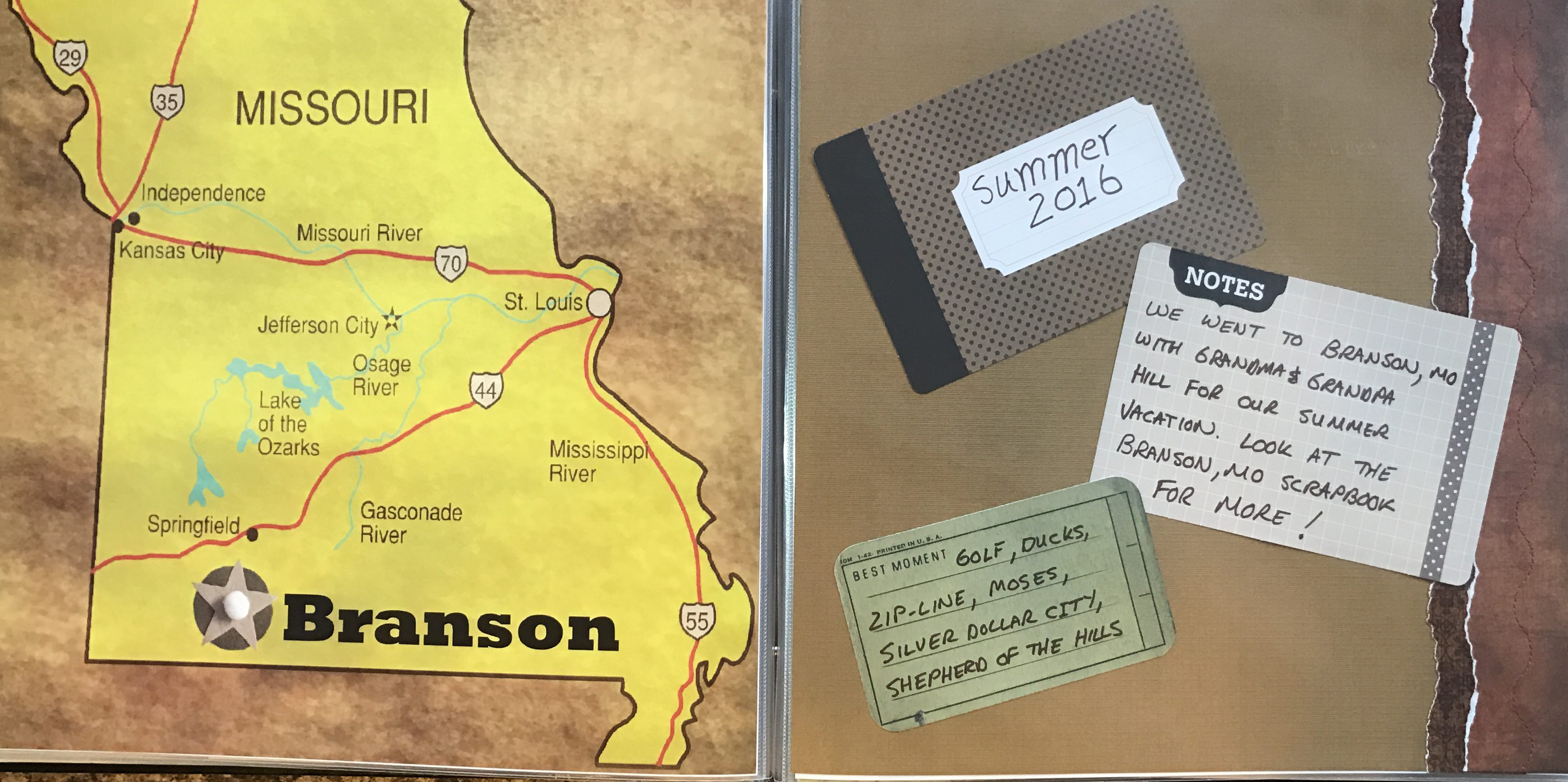 I would not normally blog about this spread because of it’s simplicity, but decided to because of its strategic placement in this album. Our summer vacation for 2016 was to Branson, MO. We had such a great time there and did so many things, that I needed to create a scrapbook just for that vacation. But, I wanted to make sure that the scrapbooks remained in chronological order, so I created this spread to go in the collection of the Junior Year scrapbooks.