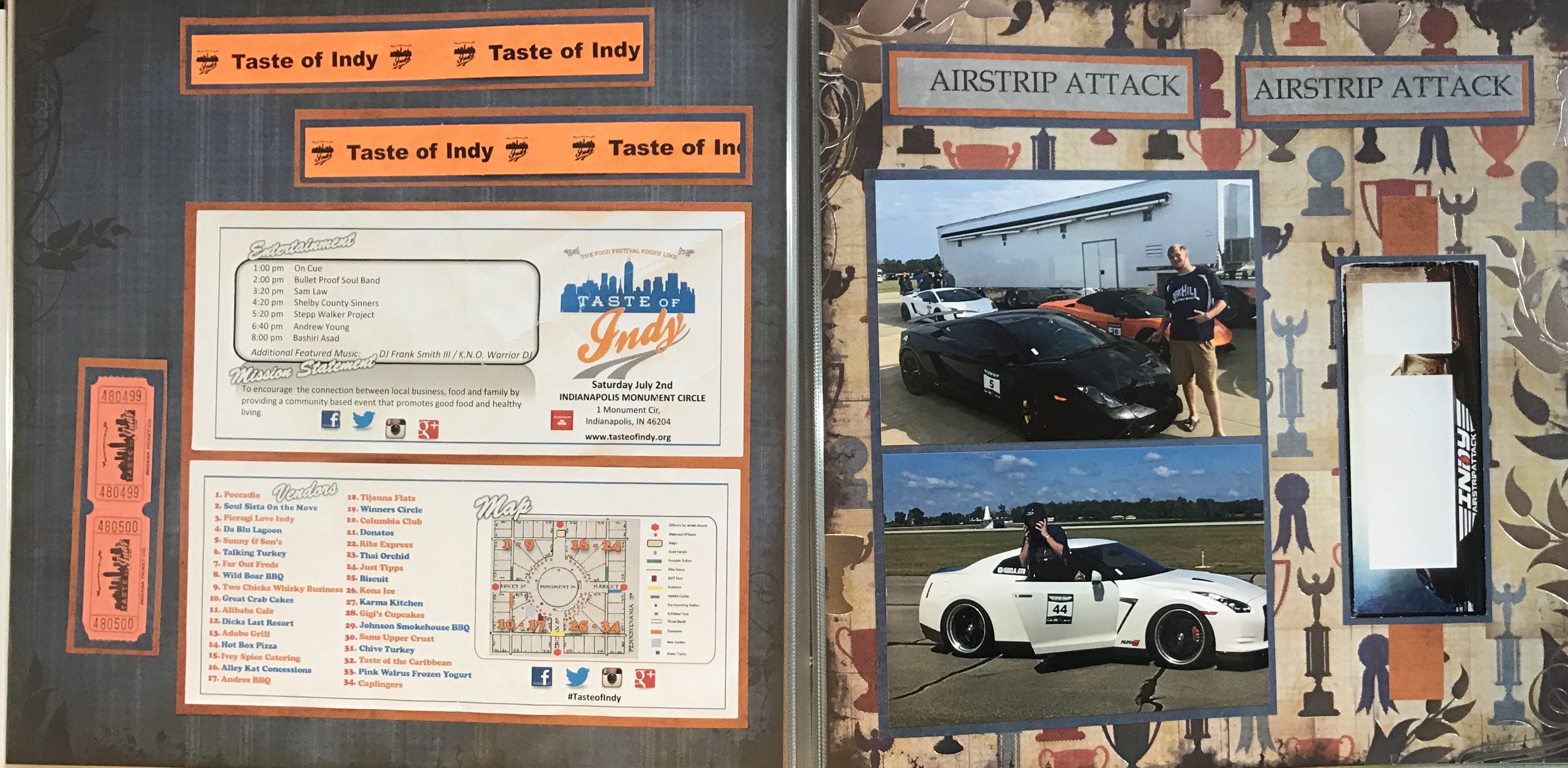 This spread is an example of blending two different events together in one spread. It showcases our trip to Taste of Indy, and our day at the Airstrip Attack.