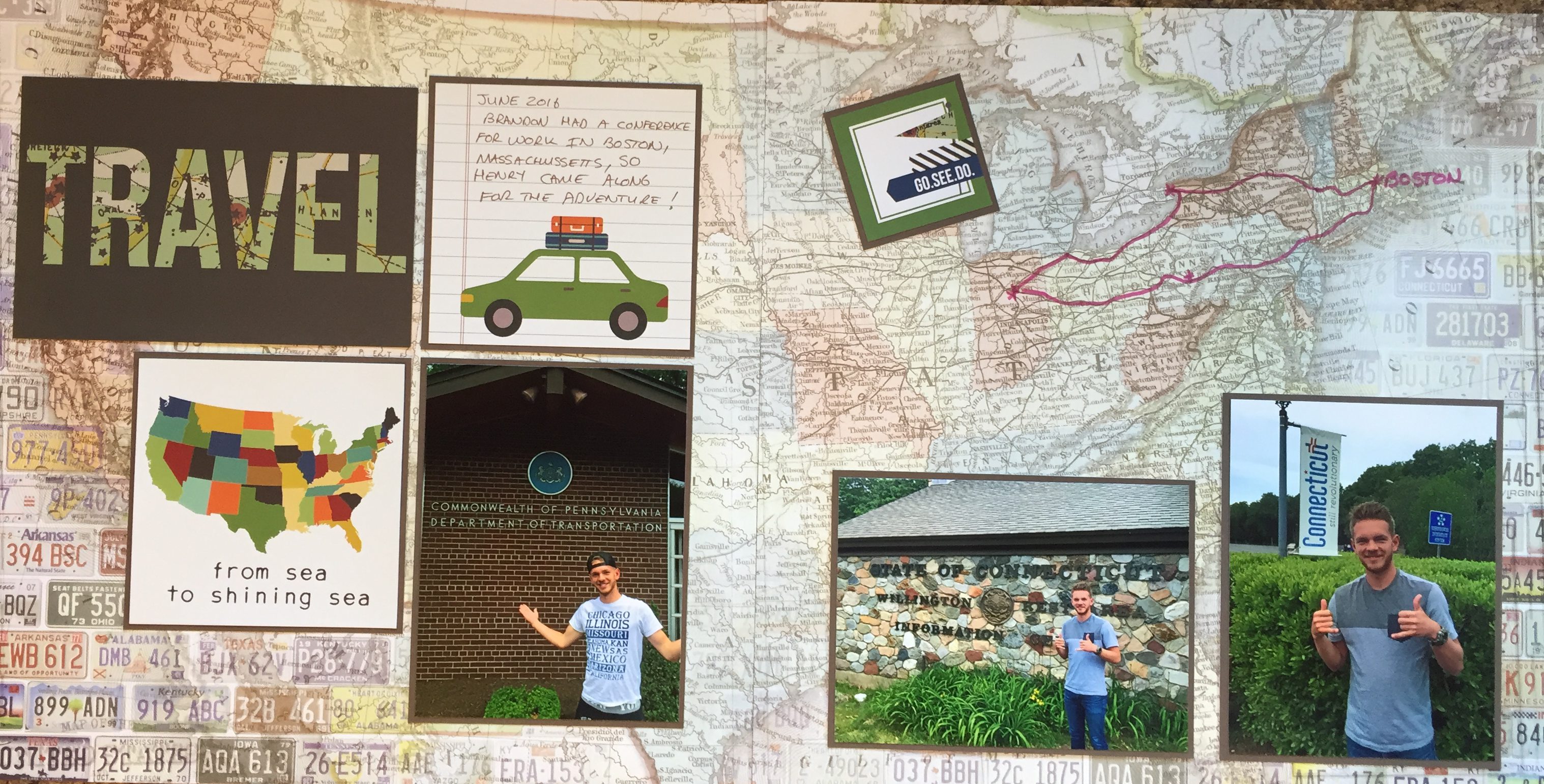 I chose background paper that us a map of the United States and then used a red marker to trace out the route that we took on the trip. I have done something similar on a couple of other pages: