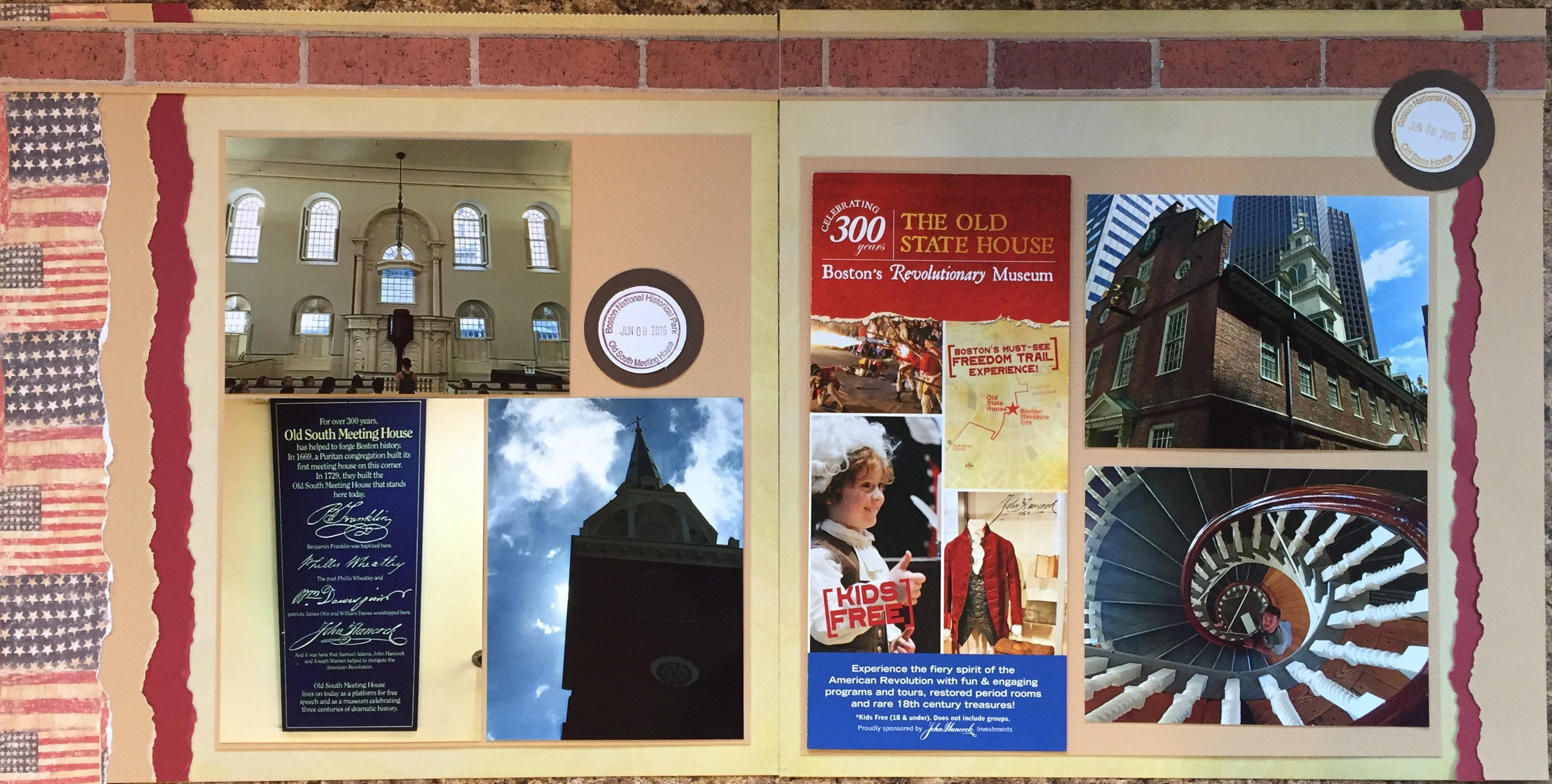 You will notice that I again used the brick strip to tie all of the Freedom Trail pages together, this time bordered in a light brown or tan color to match the color scheme of this spread. The pictures on the left hand page are from the Old South Meeting House, and the right hand page has pictures and the brochure from the Old State House. I used the same tan color for the border for these pictures.