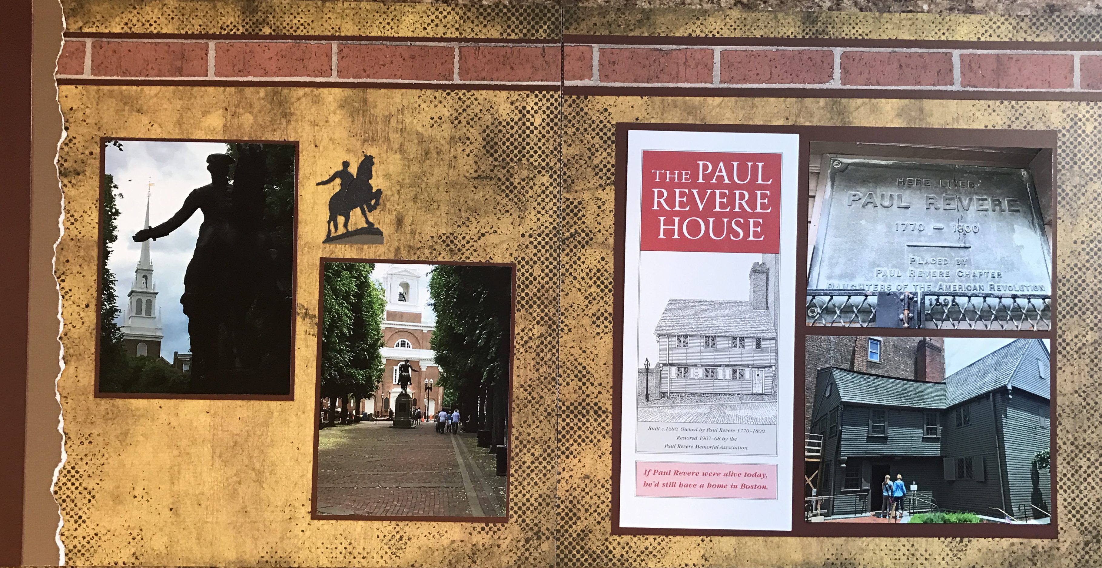 As with my other spreads on the Freedom Trail, this spread has the strip of bricks running across it, bordered in a dark brown. Starting on the left, I used a jagged edge tearing tool to tear the border. On the left page are pictures of the Paul Revere statue, and the right page has pictures from the house itself. The brochure is attached to the outside of the plastic page protector so that the reader can open it to view. I bordered the pictures with the same brown that borders the brick strip to tie the theme of the spread together.