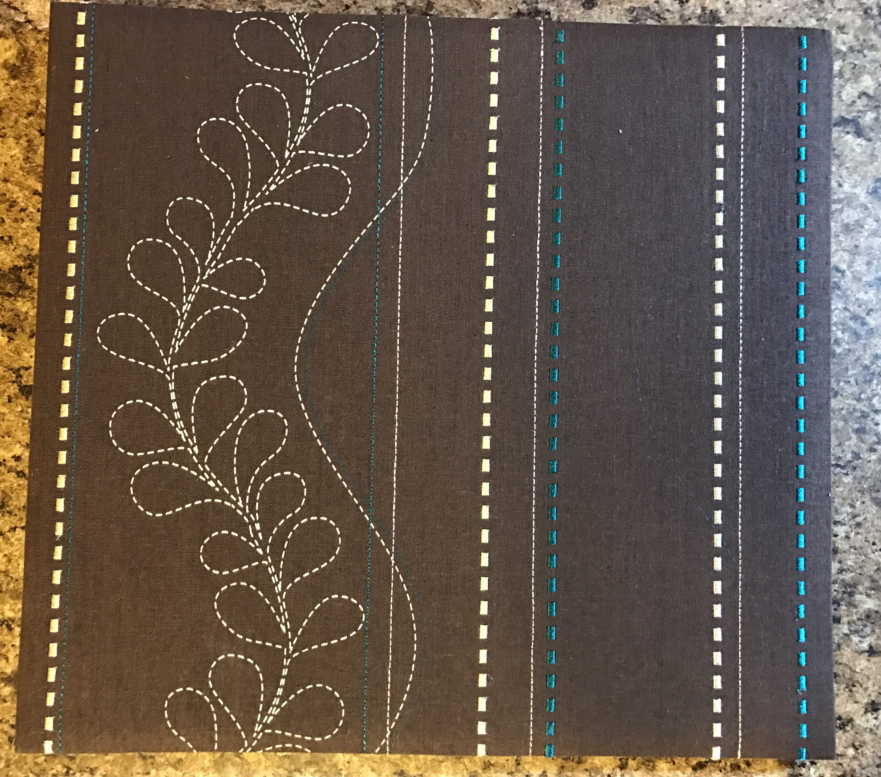 This blog starts a new adventure – our Family Trip to Branson, MO. The left-hand picture is the Title Page for this Album, and the right-hand picture is of the album cover that I chose to hold this collection. When I saw this album cover, I remembered that about 10 years ago I observed a friend of mine using a sewing machine to sew thread right onto scrapbook paper, and I decided that I wanted to try this as a theme element for this entire album. You will see that on almost every page of this album I managed to use my sewing machine in some way.