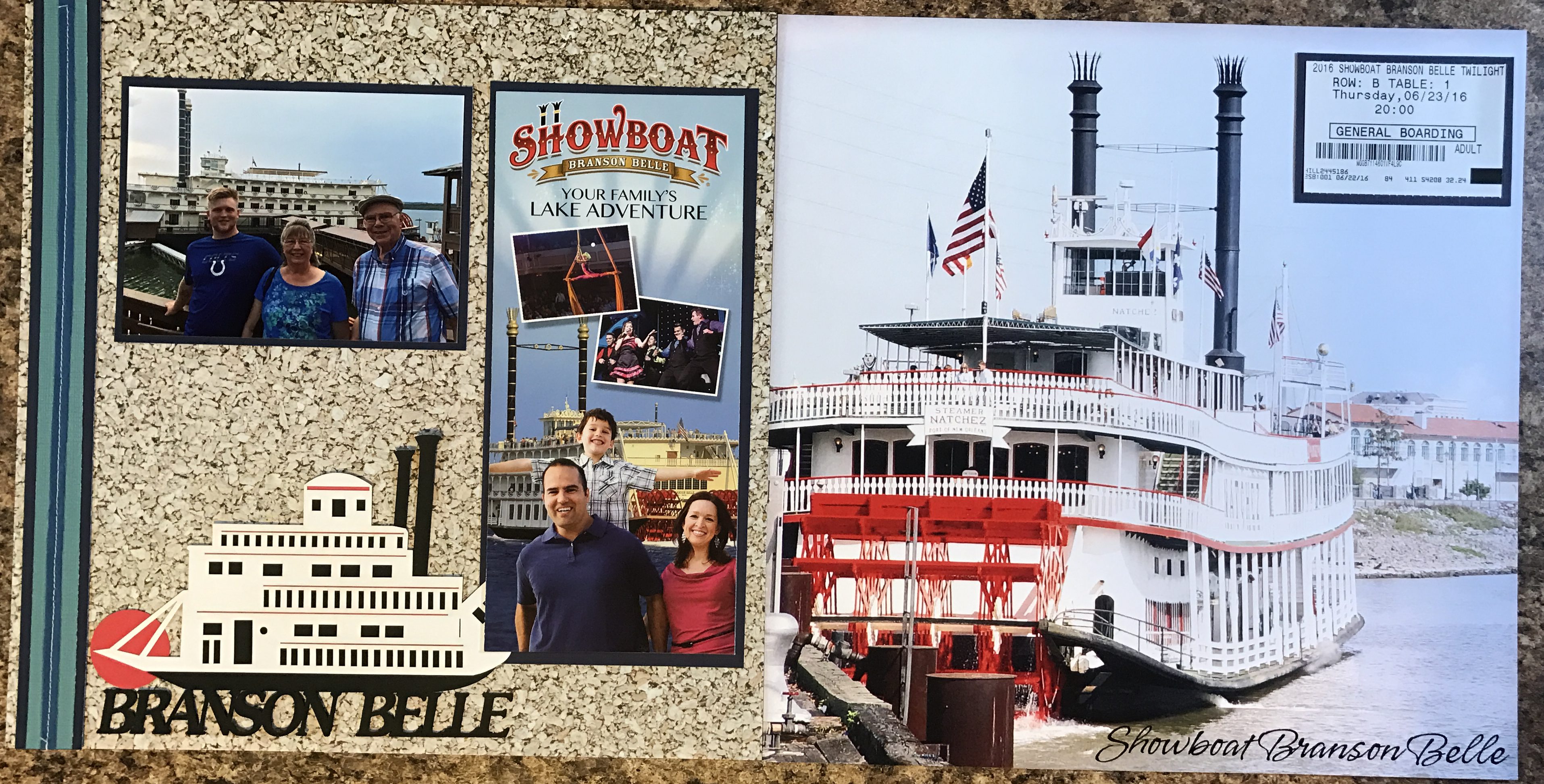 For this spread I used a background page that I purchased at a local scrapbook store in Branson, MO, (Scrapbooks Forever), and attached the ticket from the event in the top right hand corner. I bordered this in black to complement that black of the writing on the page, as well as the steam stacks.