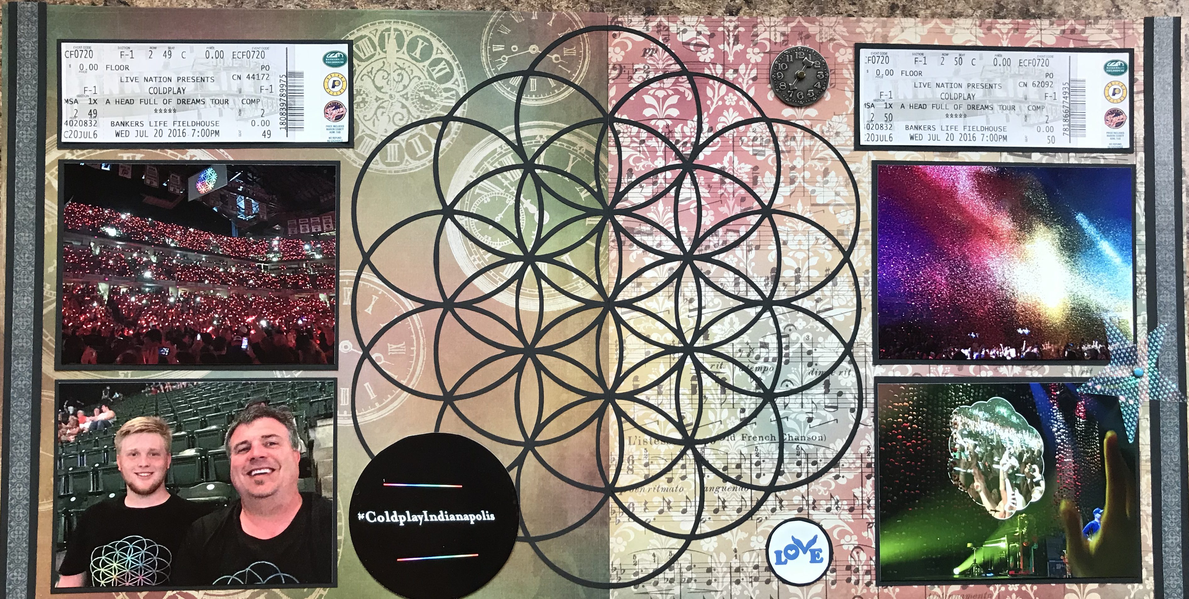 This first spread contains our exchanged tickets proving that we were in the front row (I know it says row 2 – but row 1 was short and our row 2 tickets actually were right on the stage fence because the stage curved). You will also see a watch face, to represent the song “Clocks”, and the small “Love” circle which was part of a button that was given to all of the concert goers. I chose a clocks background paper as well to match the theme.