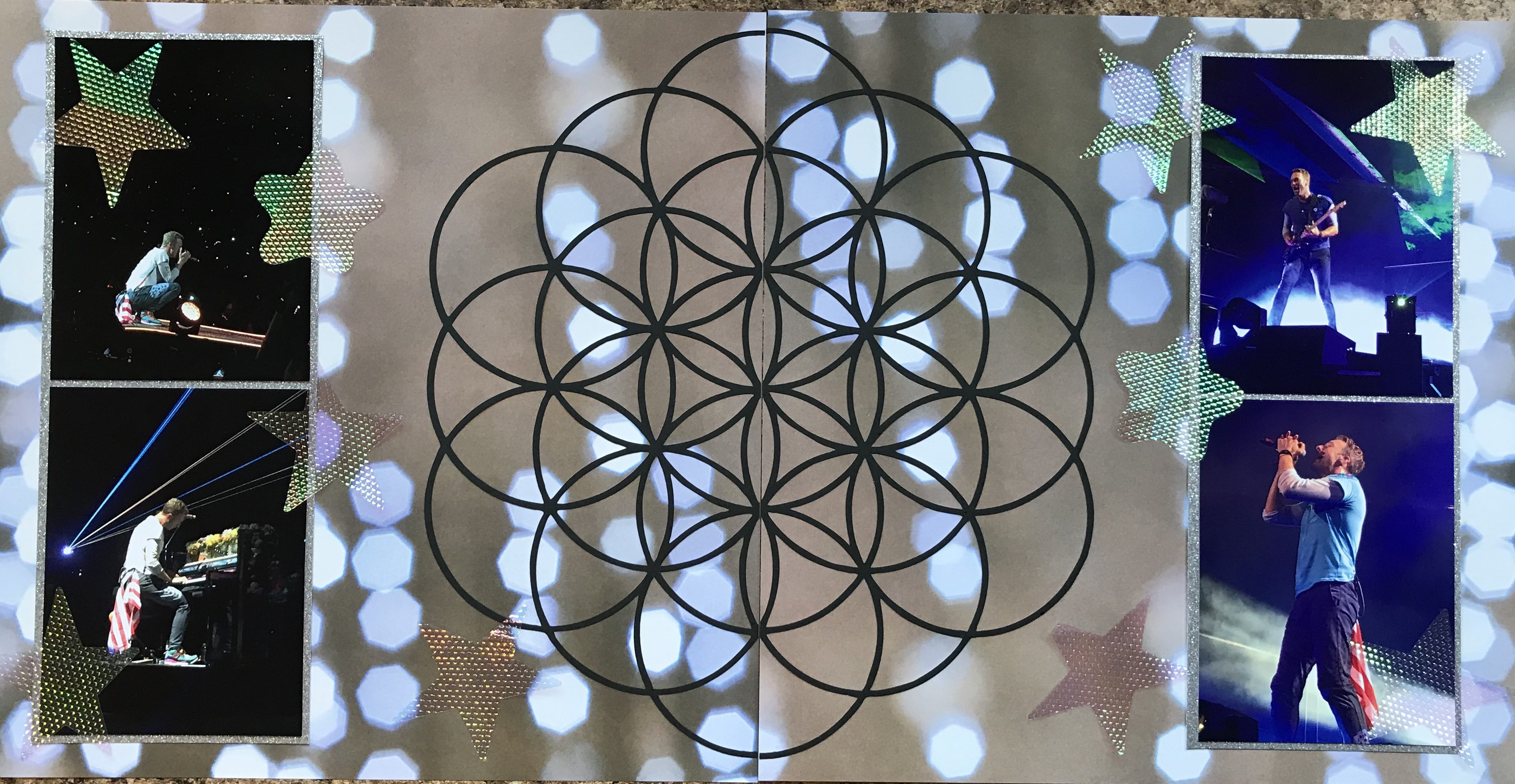 This is the third spread from that amazing night and again I used the Head Full of Dreams logo to center the page and tie the three spreads together. I chose a blurry lights background page for this spread to mimic the effect in the stadium and backed the photographs in silver to create more sparkle. I used a transparent adhesive to mount the transparent glittering stars to the page. You can actually see these better in this photograph than on the actual page. These were more of the items that were shot out of the cannons and various points in the concert. When the concert was over we were standing in about a foot of the stuff and we grabbed a bunch of it, because I knew that I would use it in the scrapbook.