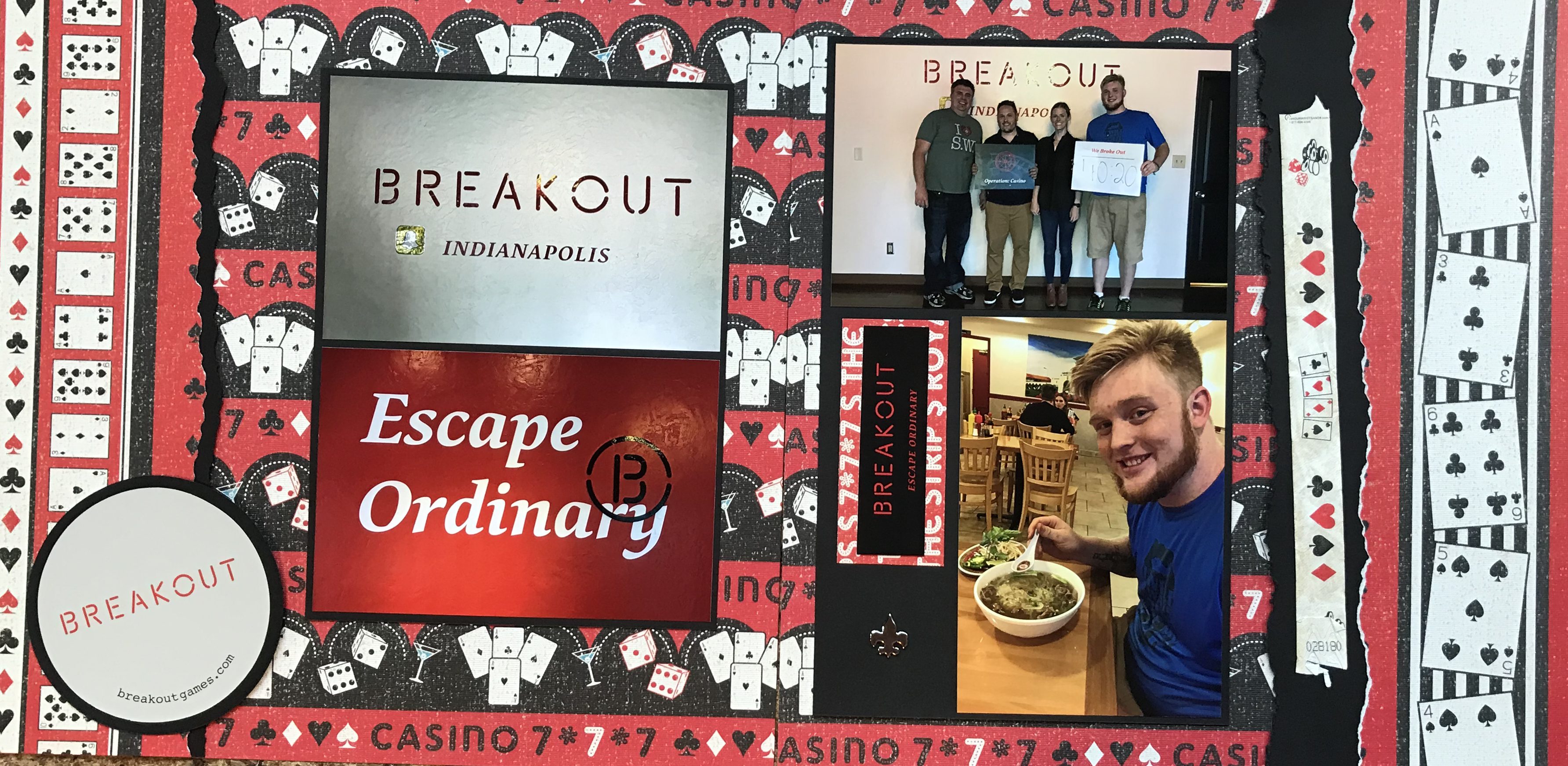 We were not allowed to take pictures inside of the game room, so all of the pictures are from the lobby. The room that we were solving was a casino theme, and so I selected gambling background papers from a paper pack that I had and perfectly matched the colors of the logo of the breakout room that we were at. I used black to border all of the pictures and ephemera, to help them stand out against the busy background page.