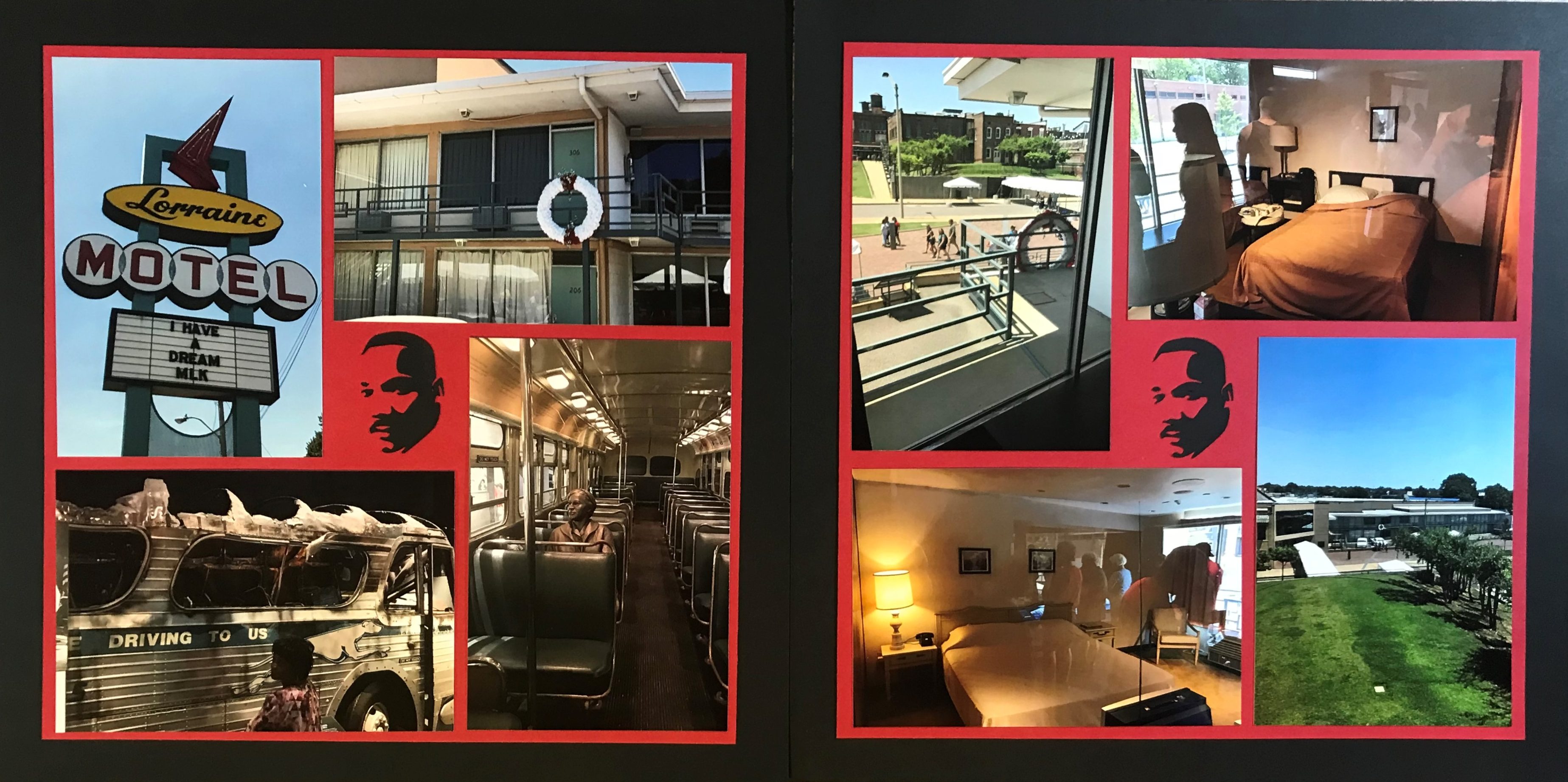 I chose a red and black theme for these two spreads to pay honor to the colors in the logo of the museum. I was able to find SVGs of Mark Luther King, Jr online, and I used Cricut Design Space to import these, and then used my Cricut machine to cut out the silhouettes that you see on the spread above and the one below.