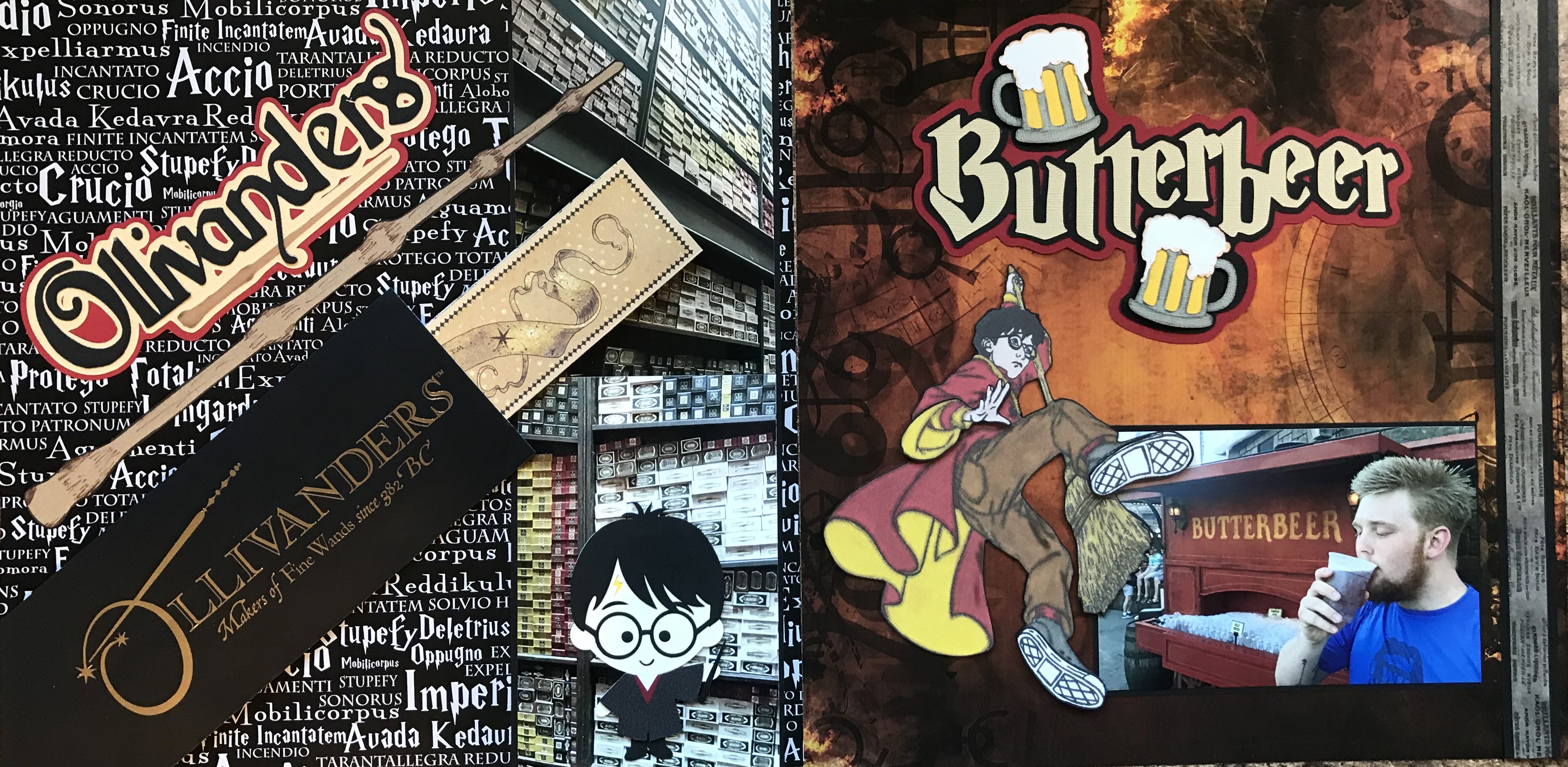 The right page has a picture of my son enjoying some butterbeer – we spent way too much money on butterbeer and butterbeer ice cream while we were in the parks. The title and the graphic of Harry Potter on the broomstick were purchased on Ebay. For the right hand border, I used washi tape to help connect the theme to the left-hand side of the spread.