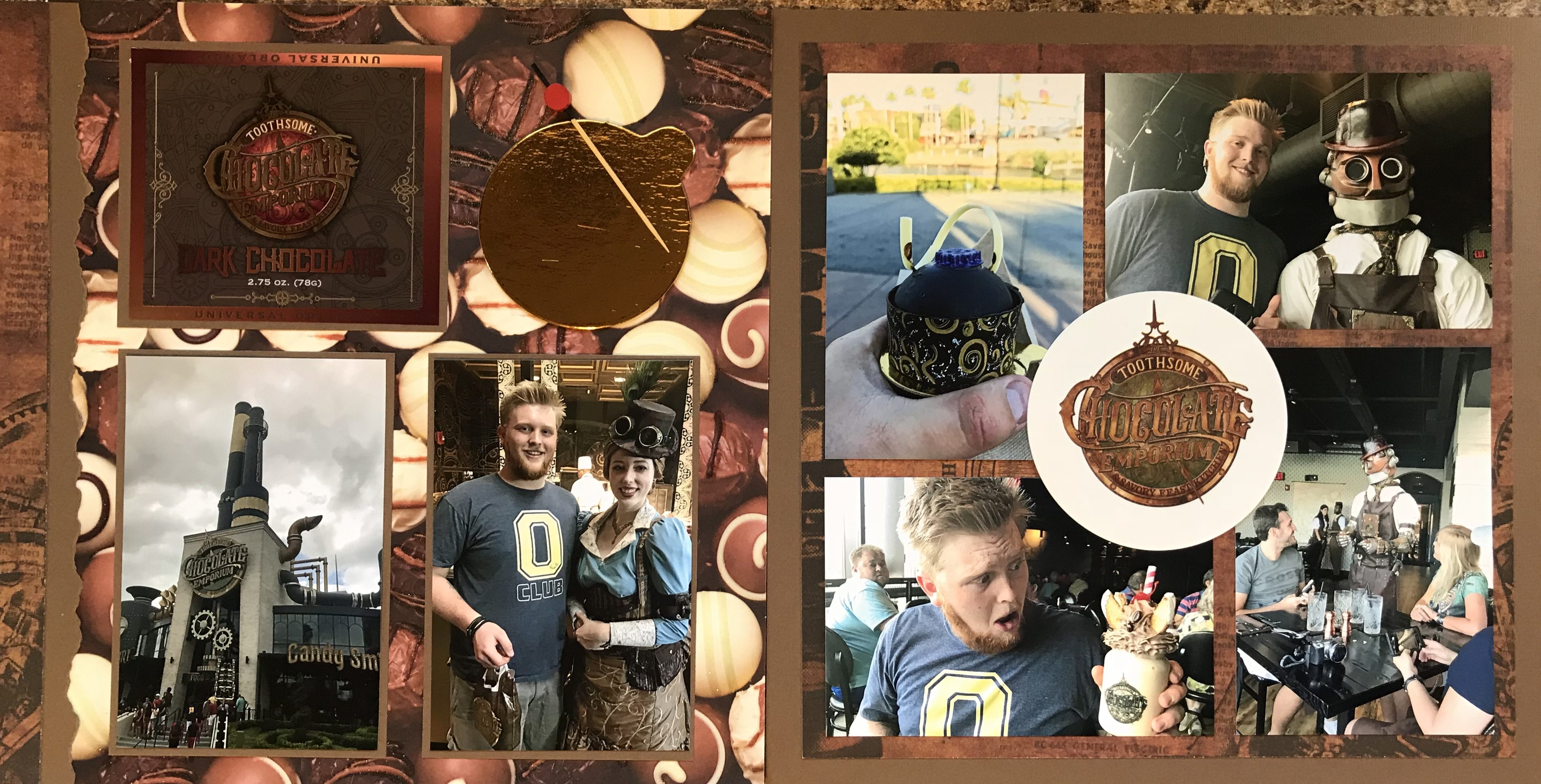 For this spread I chose a brown chocolate theme. I used a busy chocolate paper on the left-hand side, and a plain brown on the right-hand side. Then to balance the spread I chose plain brown borders for the photos on the left-hand page, and a busy brown border for the photographs on the right-hand page.