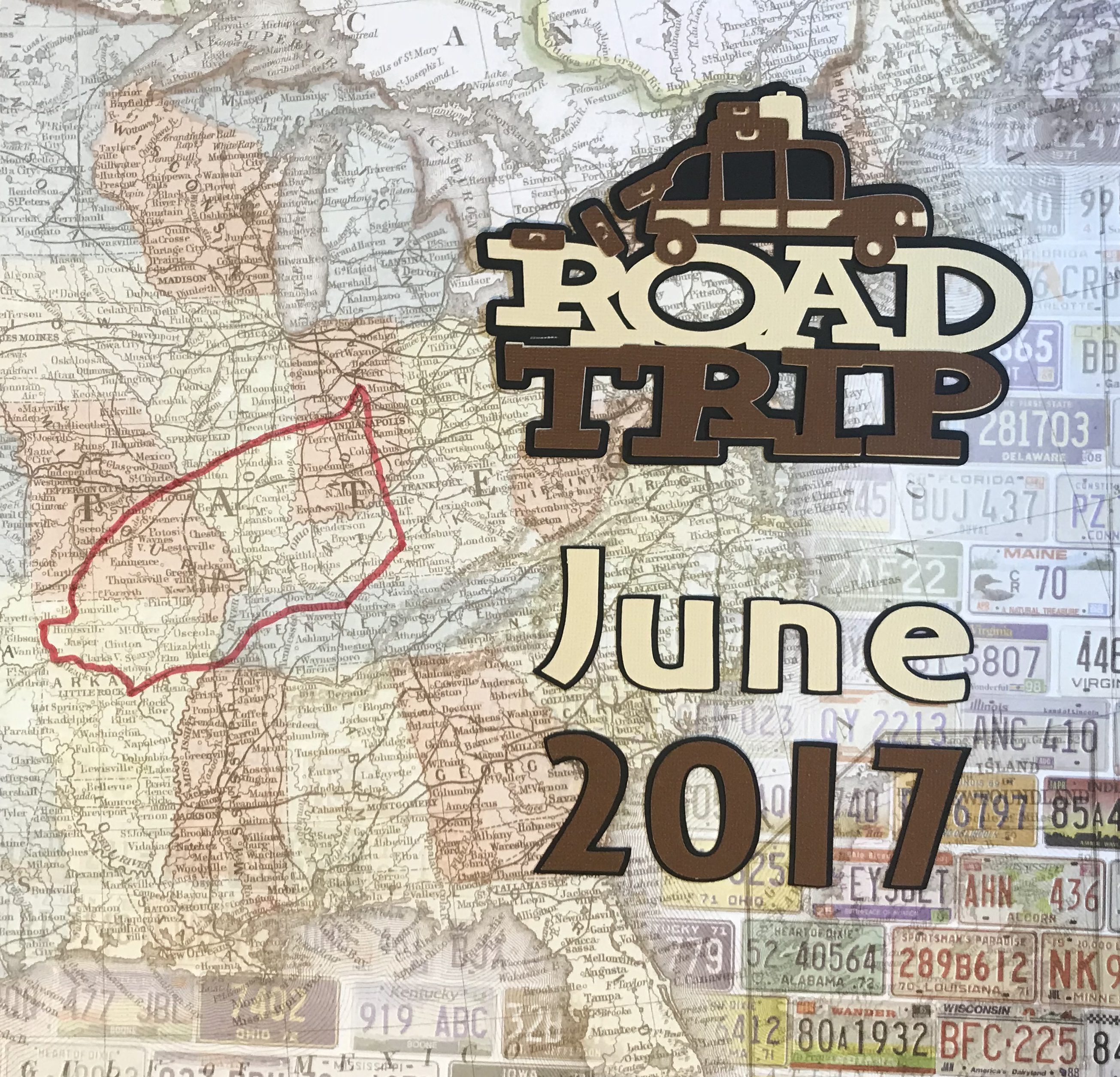 This is the title page for the album celebrating this trip. I cut the “Road Trip” logo and the date using my Cricut machine. I was able to find a scrapbook background paper that included the whole area that I visited on my trip, so I outlined the route in red, so that the viewer could see the extent of my trip. I will be honest that I tried to do this first by using red thread in my sewing machine, but it did not work well at all and ended up creating a cut line in the paper. If you click on the photo and then zoom in and look at the top part of the red outline you can see the cut mark under the read ink. I had to carefully undo all of the sewing and then I repaired the back of the paper with cellophane tape and then used the red marker to create the outline. I think that I did a pretty good job since it is almost impossible to see.