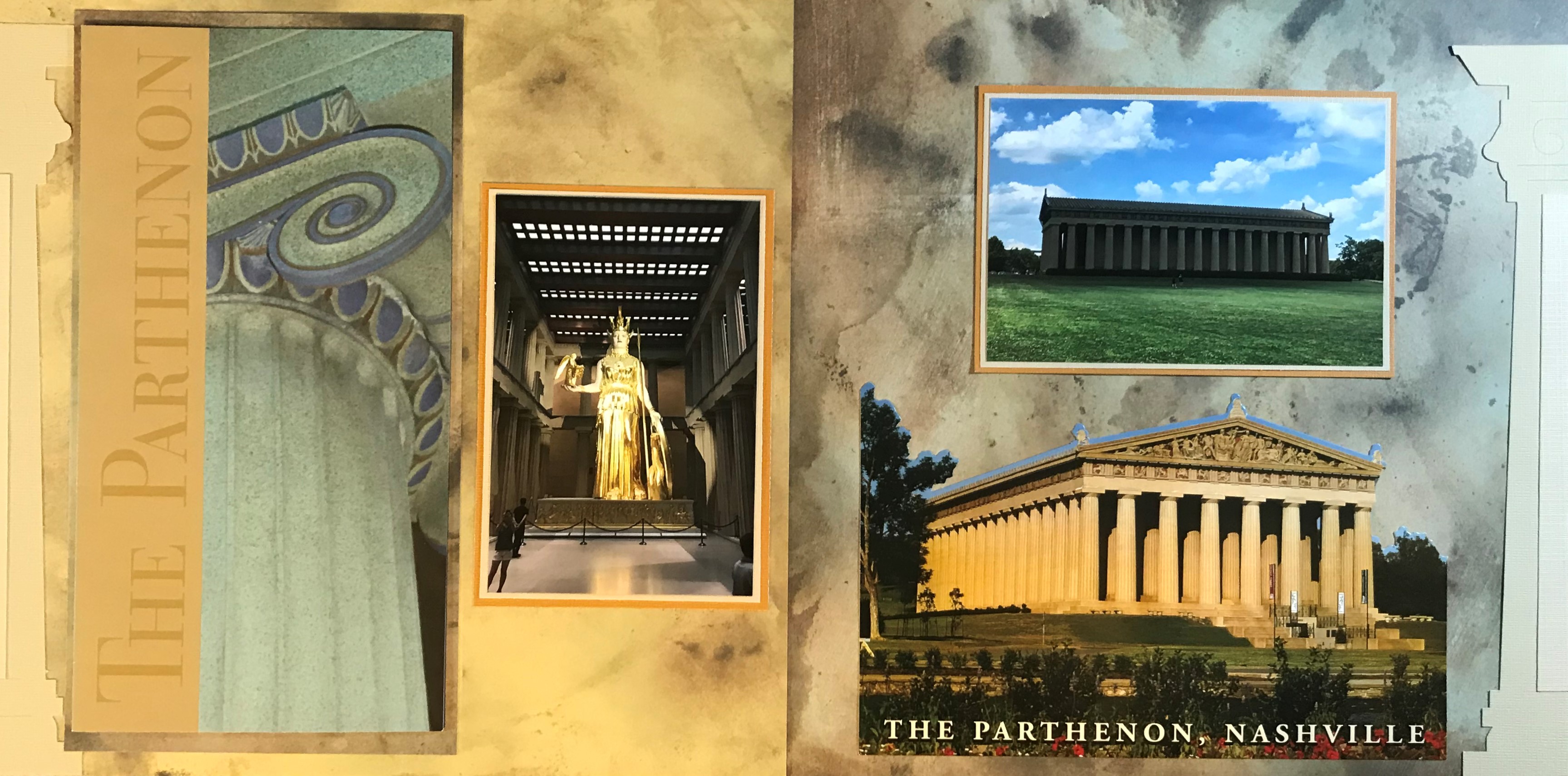 I chose a marble theme for this spread to highlight the ancient architecture replicated in this site. I used my Cricut machine to cut out the columns that border the spread. I actually just made one cut, and then cut it in half and put one half on each side. I double bordered the two photographs on the page to help them stand out against the background. The page also has a postcard that I purchased in the museum store, as well as the brochure, which is attached to the outside of the plastic page protector so that it can be open to be read.