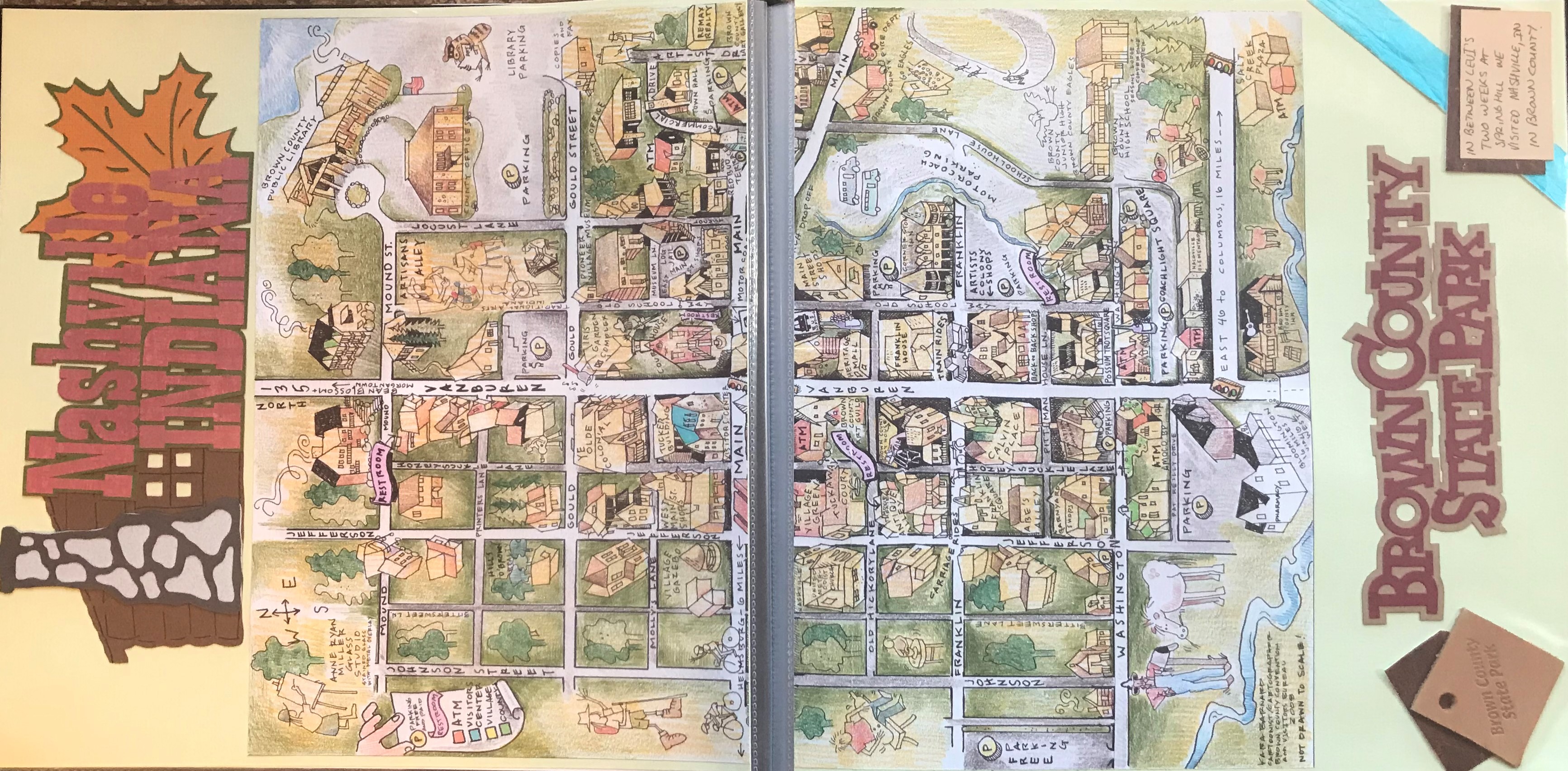 In between the two weeks at camp at SpringHill I took my son to Nashville, IN which is close to the camp – I didn’t feel like it was worth my time to bring him all the way home just to turn around and drive back. Unfortunately this was in the time frame before I had a fancy iPhone that could take good pictures and I accidentally left my camera at home and so I didn’t get any pictures. But I picked up Ephemera from this trip, and decided to make a scrapbook just with the ephemera.
