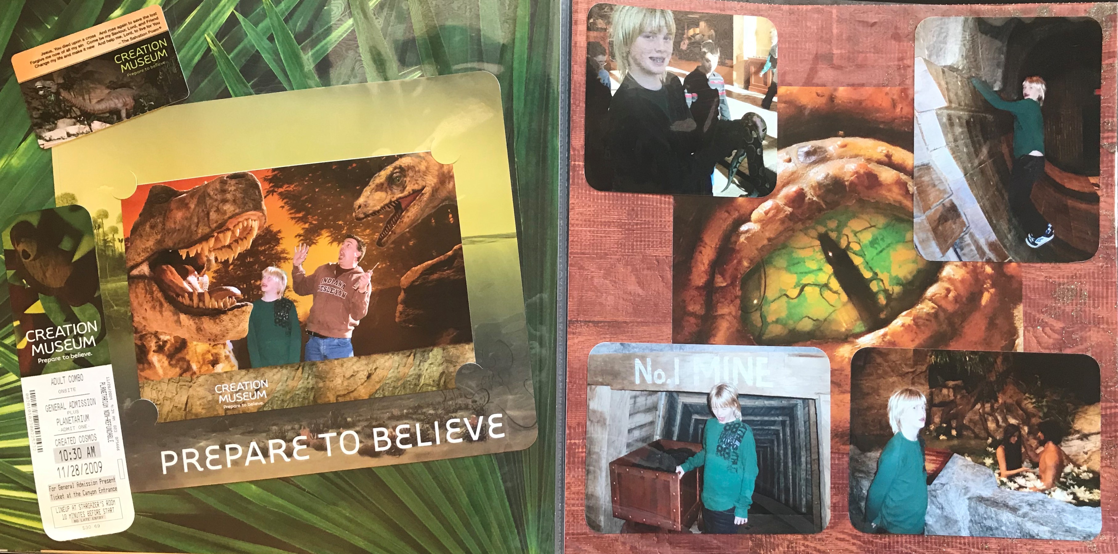 The right hand paper has a wood plank background paper to highlight the boards in the recreation “Ark” that my son is climbing on in the top right hand picture. The Dinosaur eye in the middle of this page is from the cover of the folder that the professional photo came in from the museum.