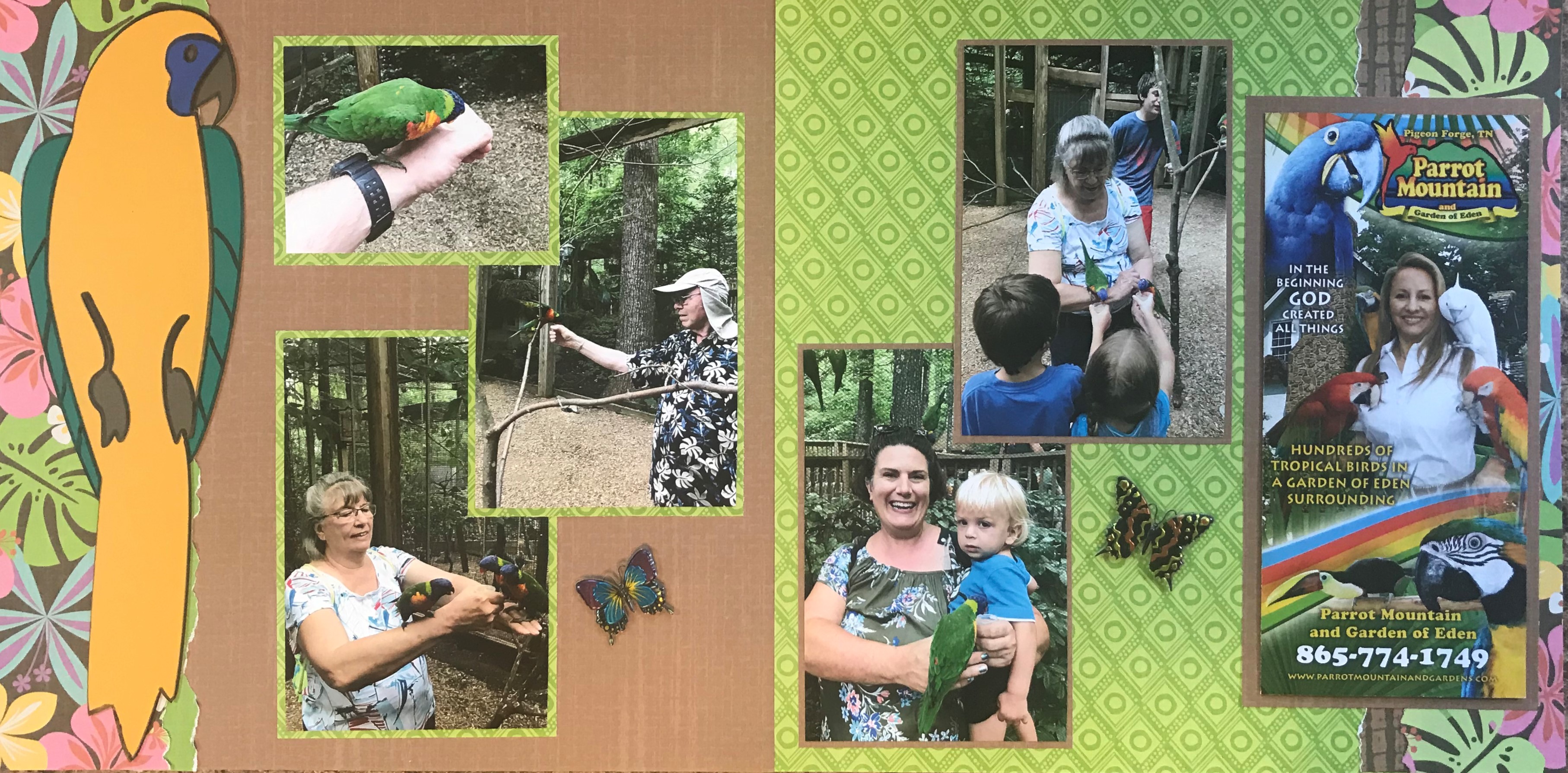 High on my mother’s bucket list for this trip was to go to Parrot Mountain – a bird sanctuary in Pigeon Forge that has hundreds of birds. I made three spreads to remember this event – both themed in bright tropical colors, to remind us of all of the wonderful colors of the birds that we saw on that day. I need to make three spreads because I took so many pictures, and I knew that my mother would love seeing them again.