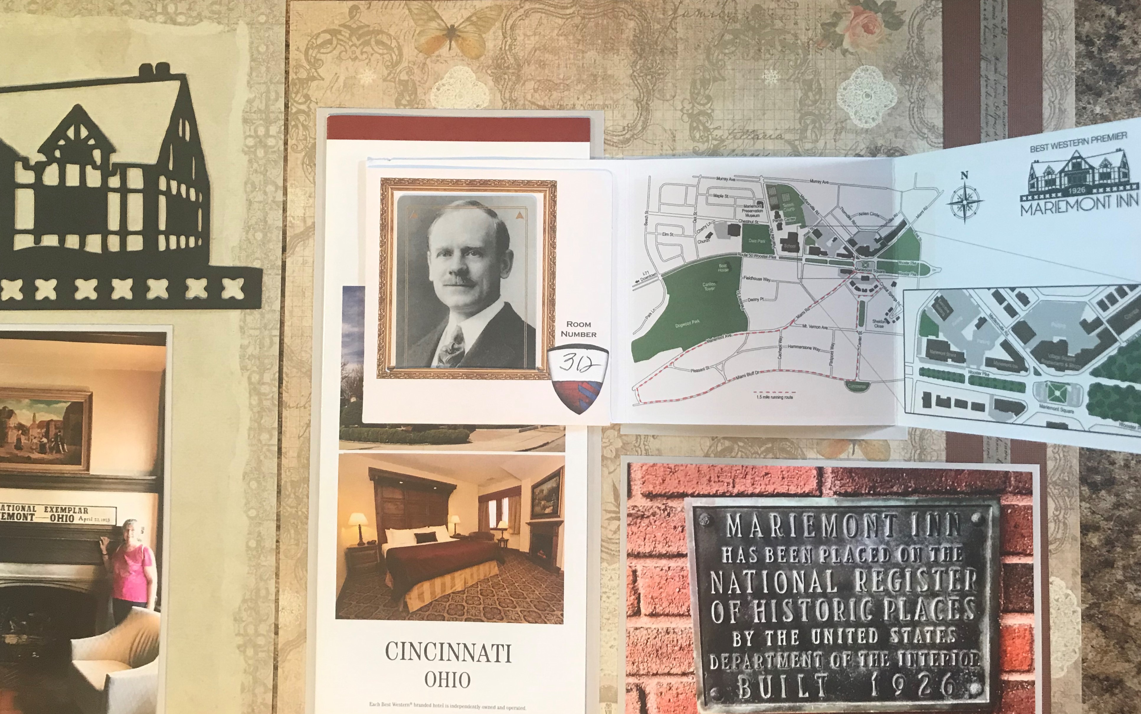 Second Album: I used a very similar format for my person album. I used the same background paper and the same Mariemont Inn Cutout. On the left hand page I used a different set of photos, and on the right hand page the layout is a little different as I did not need to add the journalling space. I was able to put in a picture of the historic plaque that is on the site.