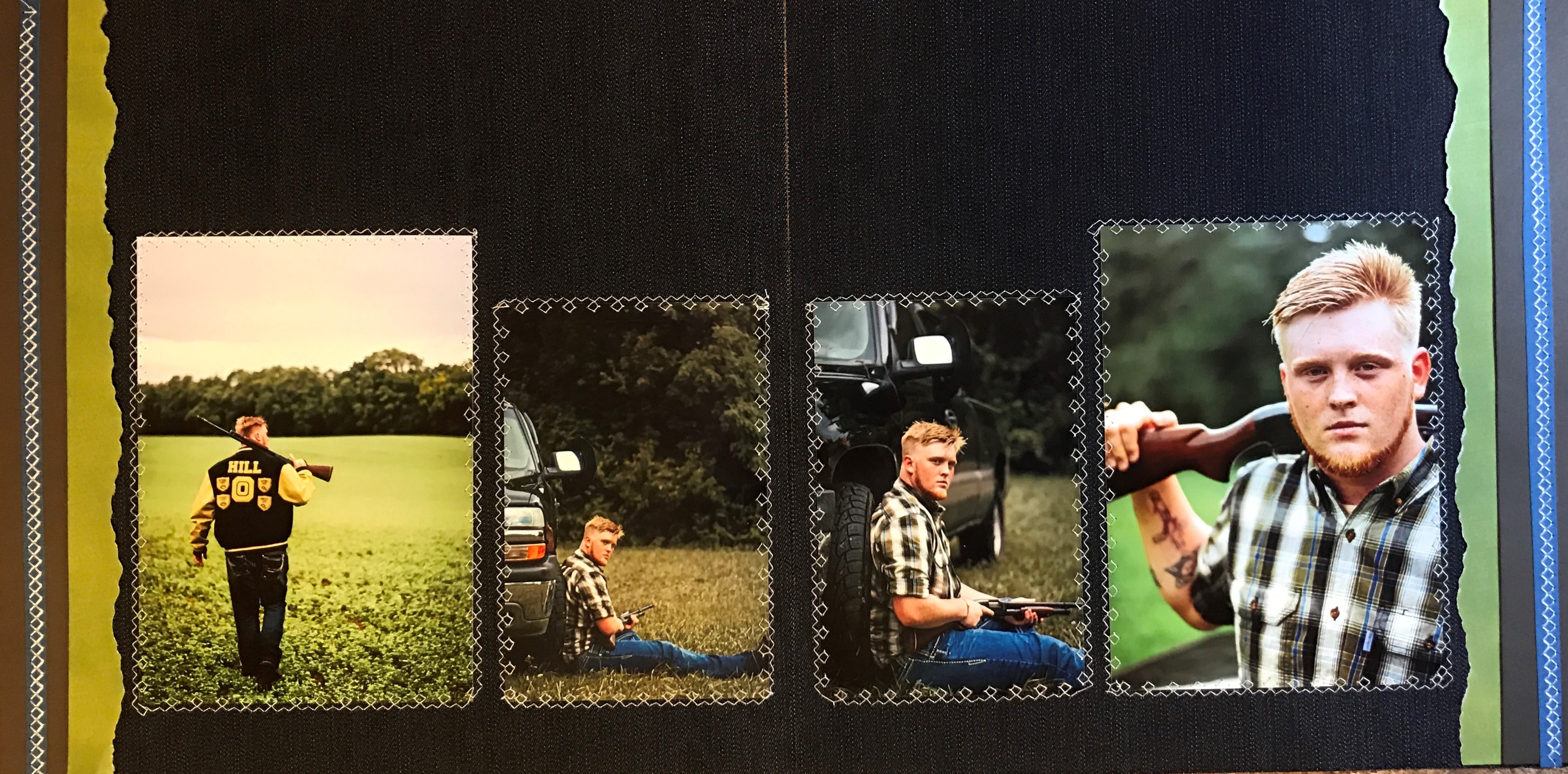 This 7th spread in the Senior Album is the epitome of Masculine Scrapbooking as the theme is my son’s shotgun! As in the other pages in this album, the background paper is denim, and I used my sewing machine to stitch the photos directly to the background paper, both serving as the border and the method of affixing it to the page.