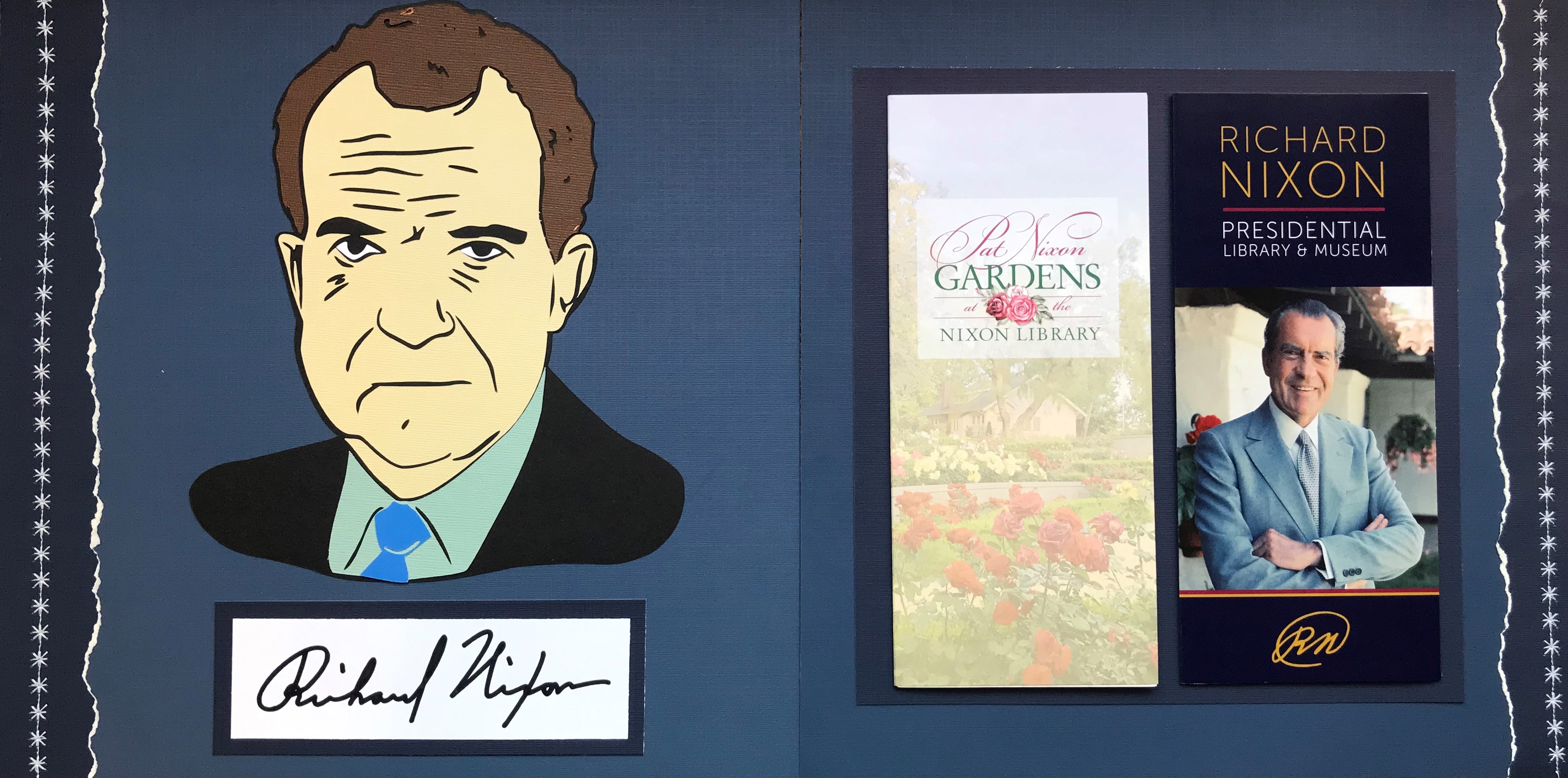 This last spread comes after the panoramic set. I felt like I had so many photographs and items that I couldn’t fit it on 6 pages, but didn’t really have enough for 8 – so I used my Cricut machine to make the cutout on the left hand page which I found by Googling “Richard Nixon SVG” – It was too good to pass up. I also found his signature in an SVG form, and used a Calligraphy pen mounted in my Cricut machine to write it out – I think that it turned out pretty good.