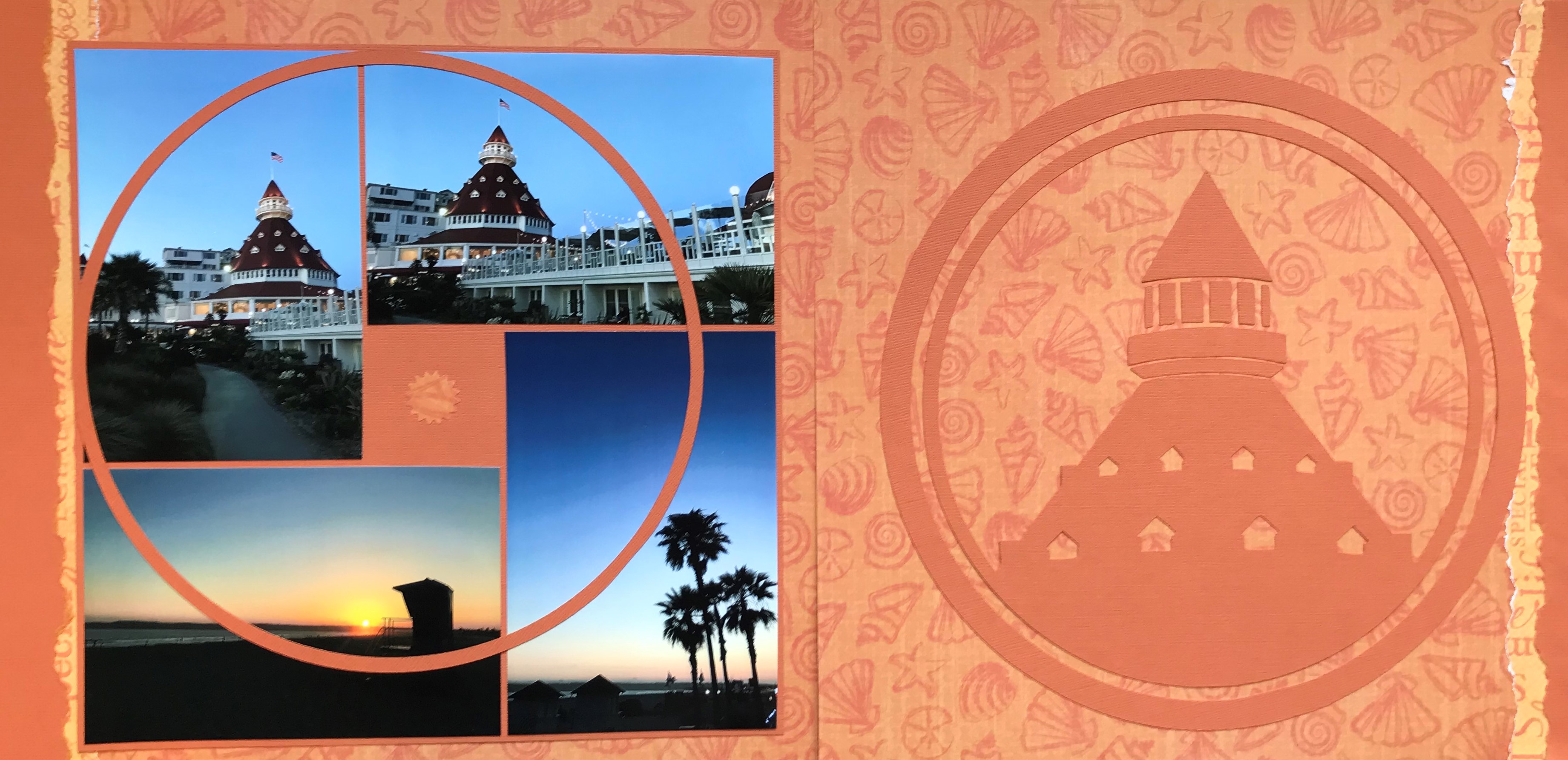 I chose an orange theme for the spread to highlight the colors of the sunset. I found the graphic on the right hand page of the Hotel Del iconic roof line online and then used my Cricut Machine to cut it out. I used the leftover ring from the graphic on the left hand page as I thought that it added some interest to that page and drew ones eye in. I used a jagged edge tearing tool to create the rough borders on both sides of the spread.