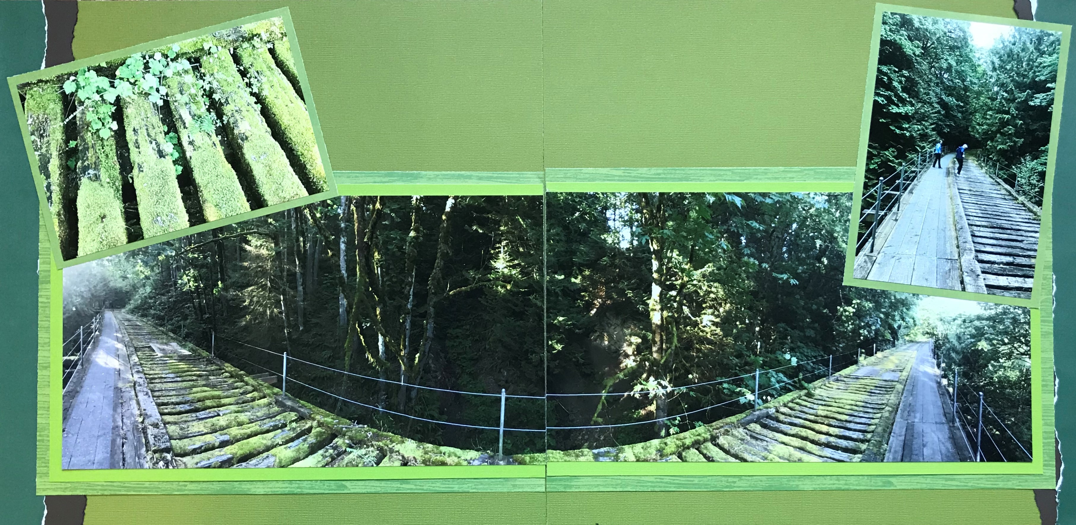 The second spread shares some pictures that I took of an old railroad bridge that was one of two on the walking pathways at the Retreat Center. I had taken a 180 degree panoramic photo of the bridge while standing at the middle point and thought that it turned out really cool – so I had it printed in large format for this page. I continue the green theme on this spread to help tie the three spreads together. I used a double border on the panoramic photo to help it stand out a little more, and I used a jagged edge tearing tool for the borders on the sides of the spread.