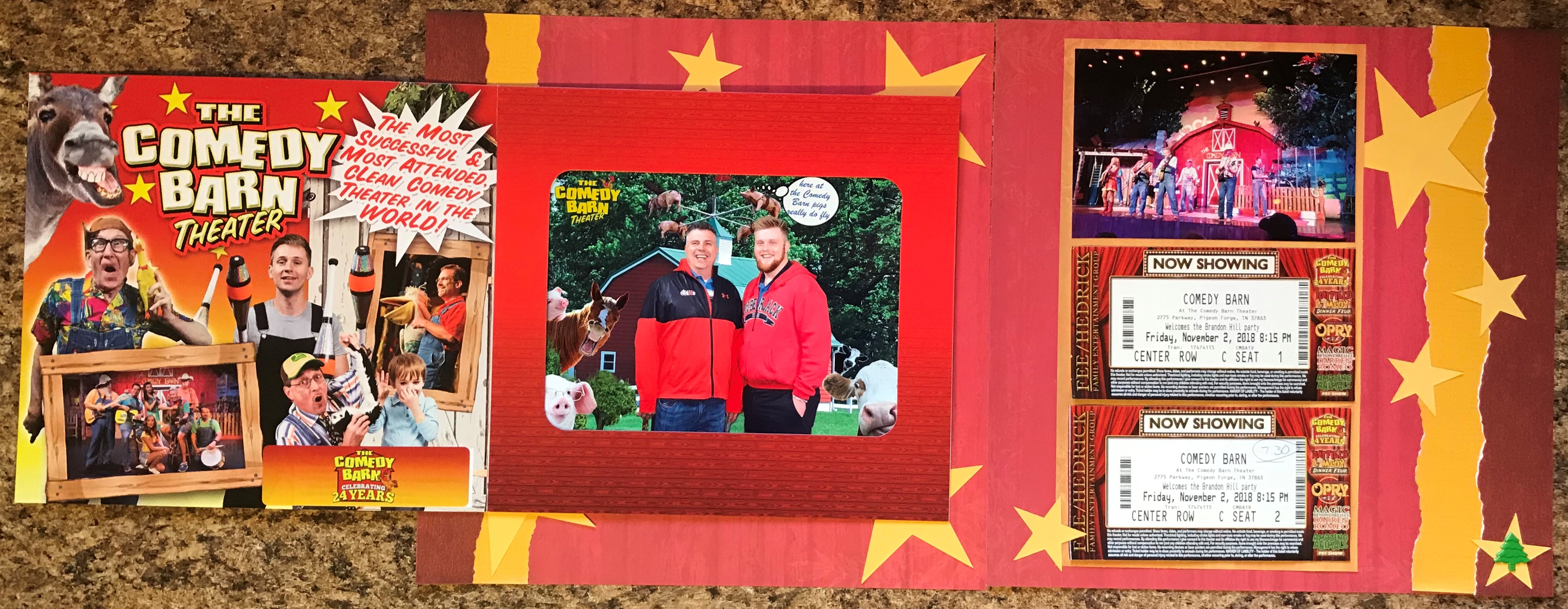For this spread I used the color scheme in the event photo sleeve that is on the left hand page. I used a jagged edge tool to tear the borders and my Cricut Machine to cut out the various size stars. The right hand page has our tickets for the event and a picture that I took during the show.
