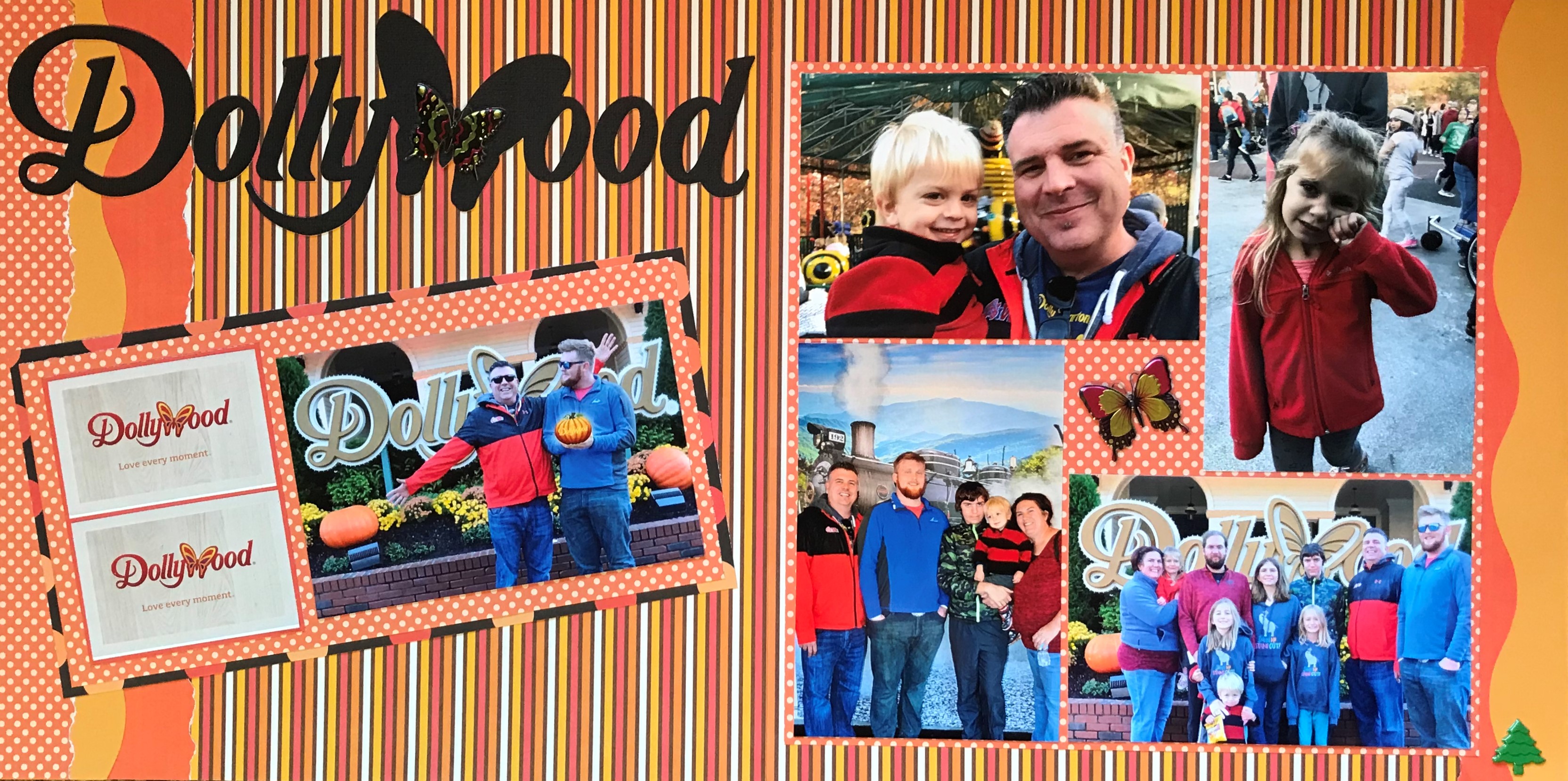 I used my Cricut Machine and Cricut Design Space to create and cut out the Dollywood Title, and a jagged Edge Tearing Tool to create the borders. I layered the tickets and entrance picture 3 times in order to help this stand out against the lined background paper, and made sure that some butterfly embellishments were on the page as this is a signature item for DollyWood.