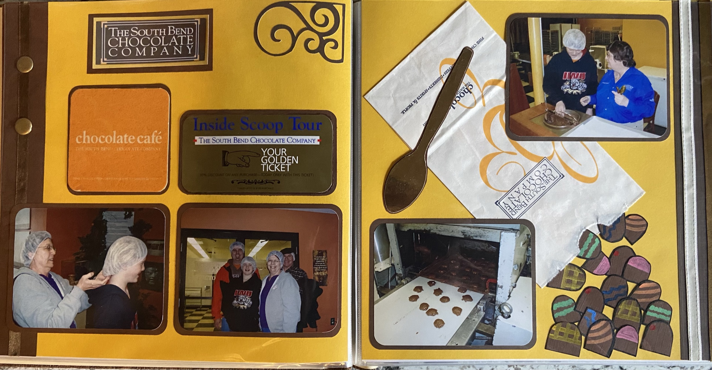I had a lot of fun creating this page, especially adding in the ephemera. I chose yellow and brown as the theme colors of this spread and bordered all of the photographs in brown to help them stand out on the page. I used a corner cutter to round the edges of the photos and the borders – to mimic the round chocolates.