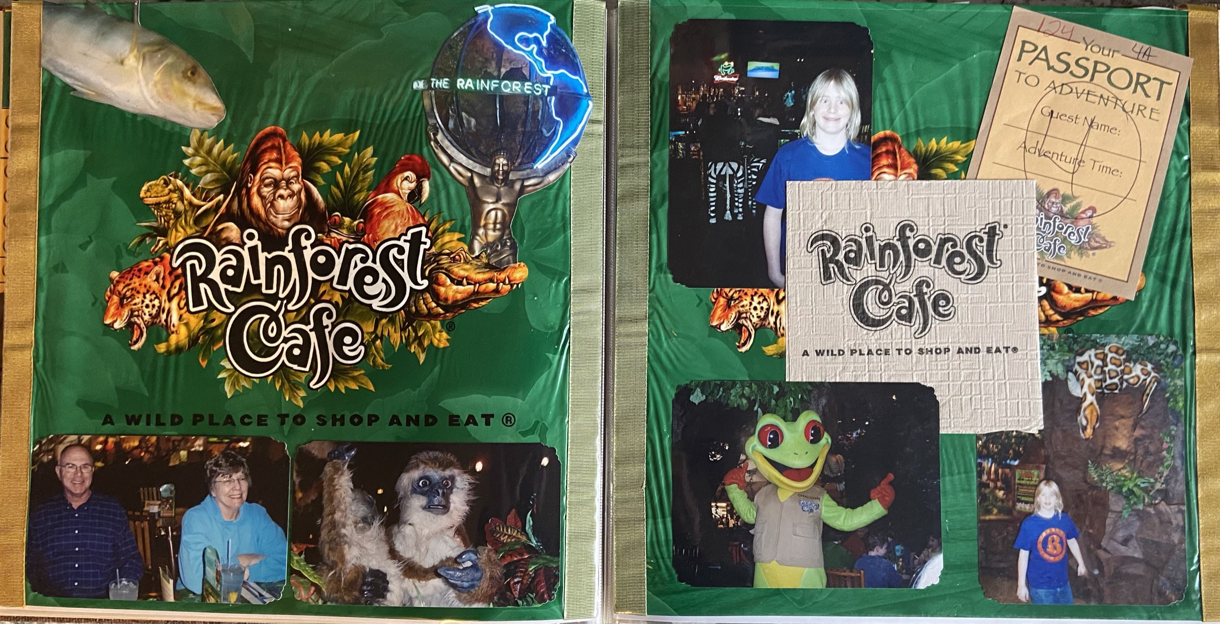 I tried something unique with this page – I used the plastic bag from the gift store as the background paper for this spread. While it looks pretty cool it was pretty hard to affix it to the cardstock. I ended up wrapping it around the cardstock and using tape to affix it to the back of the cardstock. I used gold and green ribbon for the borders of the pages.