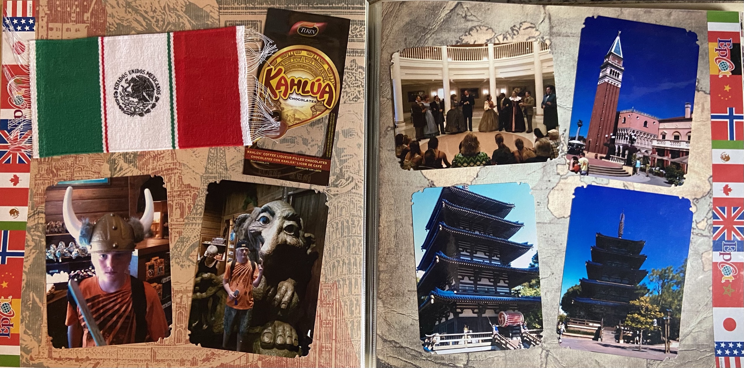 The left hand page has a picture from the England showcase and a Twining’s Tea Bag. The story behind this tea bag is that my son was enjoying the Kim Possible interactive adventure. He was very excited about this because as part of this adventure they gave kids a “cell phone” that interacted with the different countries exhibits. It has since changed into other formats but I believe a version is still possible to participate in. The phone would ring when he was near certain areas and he would be given different tasks to do and when they were done something cool would happen. In the English showcase he had to go into the English gift store and tell a worker that “Danger is my cup of tea”. When he did this they gave him this tea bag – so it made it into the scrapbook!