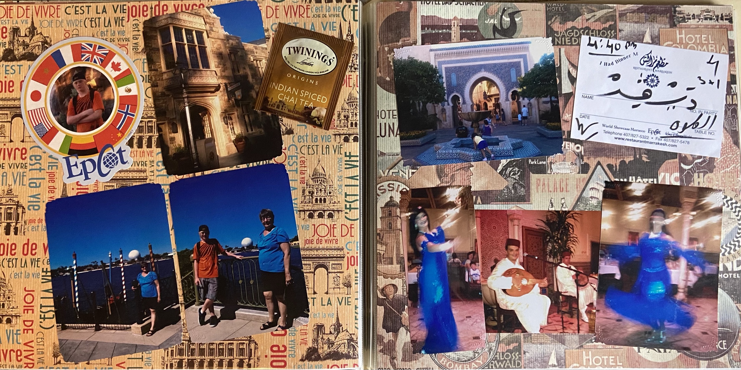 The right hand page has pictures from Marrakesh – the Moroccan Restaurant that is a focus of the Moroccan showcase. You can enjoy amazing Moroccan food (we love the lamb) along with belly dancing entertainment. This is the place that we always choose to eat when visiting EPCOT. The ephemera in the top right hand corner is our reservation card for supper.