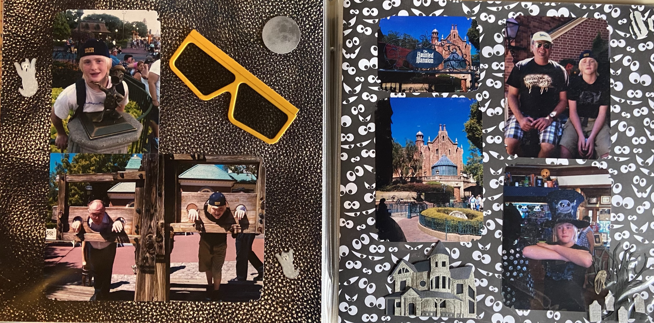 The third spread has a set of pictures from Liberty Square. My favorite pictures from this spread are my son and my dad in the stockades on the left hand page. I included the 3D glasses that came from Philharmagic – Sorry Disney for not turning them back in! I used a strong knife to cut the arms off so that they could be attached to the page. The pictures on the right hand page are from the Haunted House, which is why I chose dark background paper and there are ghosts and tombstones on the page. I used a corner punch to create the decorative corners on all of the pictures on this page.