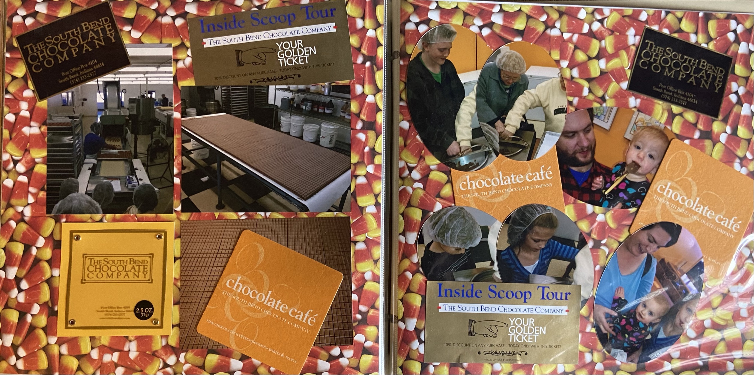 On the right hand page I cut all of the pictures of us enjoying our chocolate covered golden spoons into an oval shape to mimic the shape of the head of a spoon. Tickets and coasters are included on both pages as well as some chocolate box stickers that some of the workers gave me when I told them that I would use them to scrapbook this event.