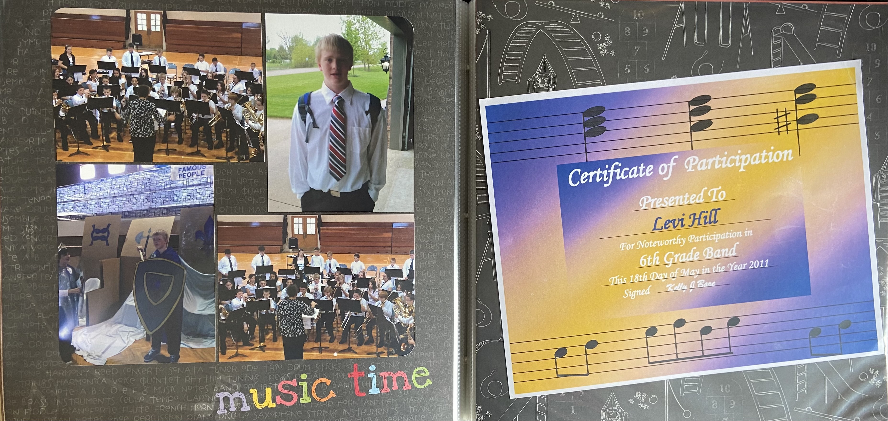 This spread is from a couple of different events during the sixth grade – band concerts, medieval presentations, and a great place to show off his band participation certificate.