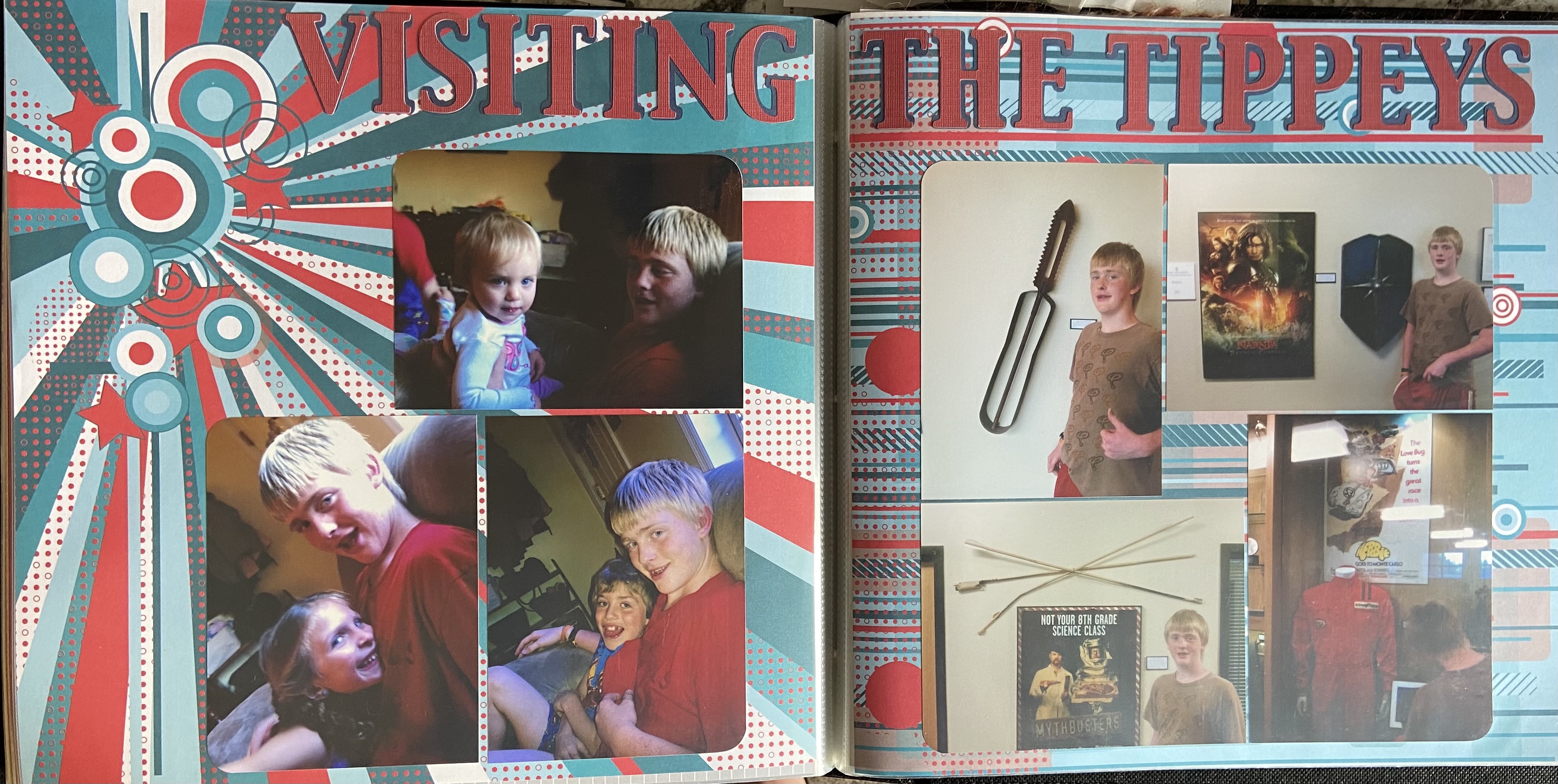 The background for this spread was chosen based on the color of my sons shirt in the left hand page, as well as representing the high level of energy that was in the air during our visit. The left hand page has pictures of my son with his cousins. He served as a jungle gym for most of the visit :).