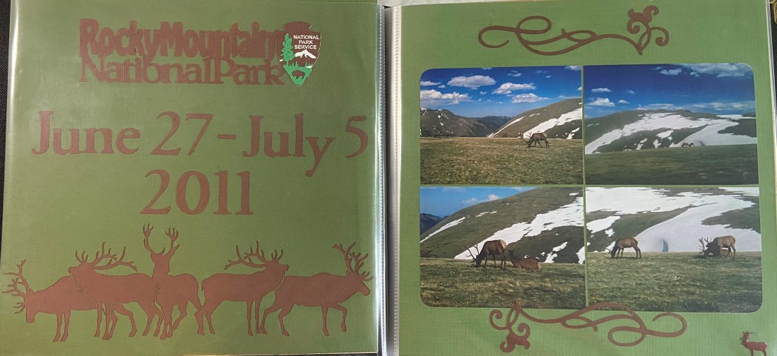 The Title Block on the top left-hand page was purchased at a local scrapbook store that I was able to visit on one of the days of the trip, as well as the collection of elk. I used my Cricut Machine to cut out the dates and the scrolls that are on the right-hand page.