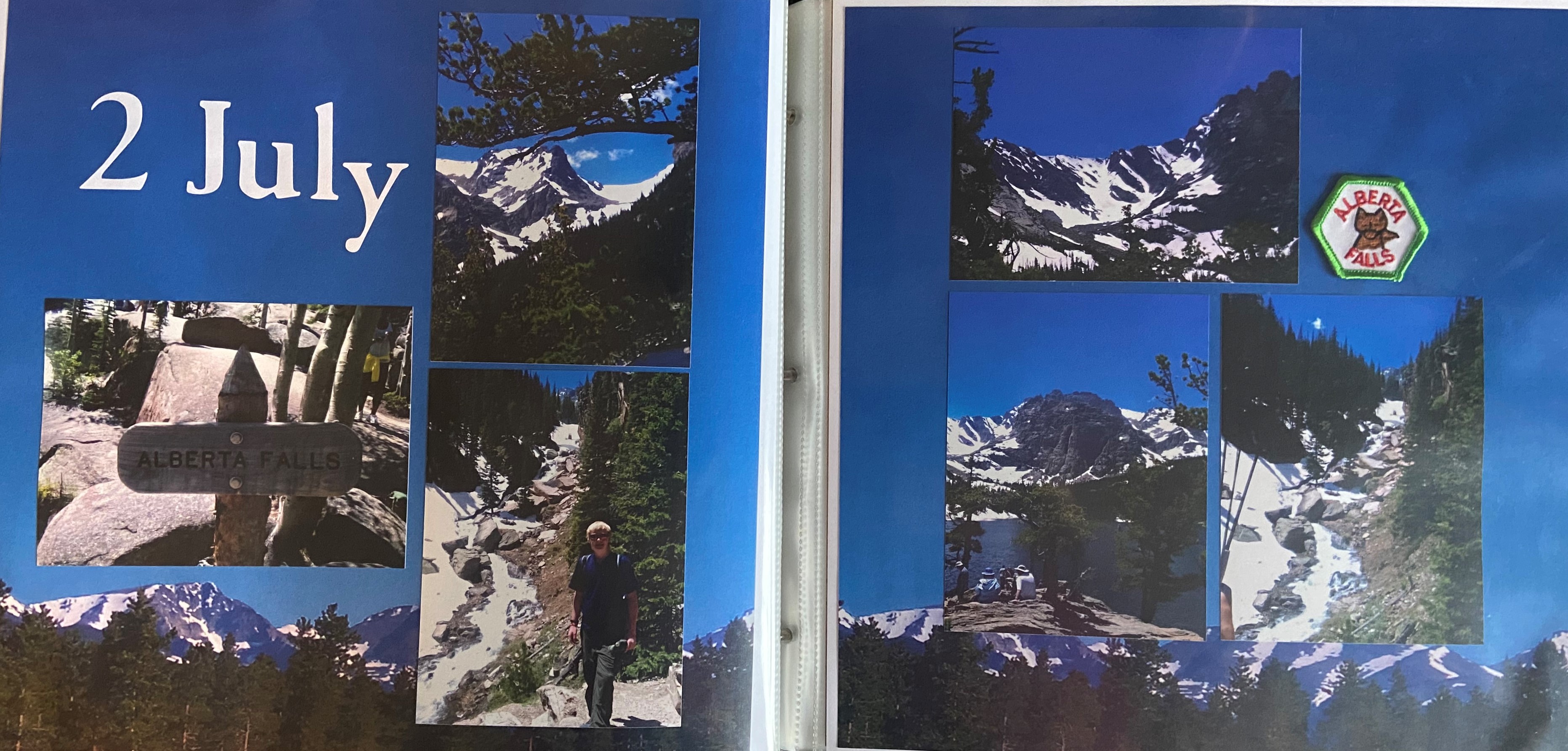 On our fourth day we took a day hike to Alberta Falls. I really love this page for the colors. The background paper is a photograph that I took and made into a digital album so that I could cut those pages out for background paper. I love the blue of the sky and the blue in the pictures that are on the page.