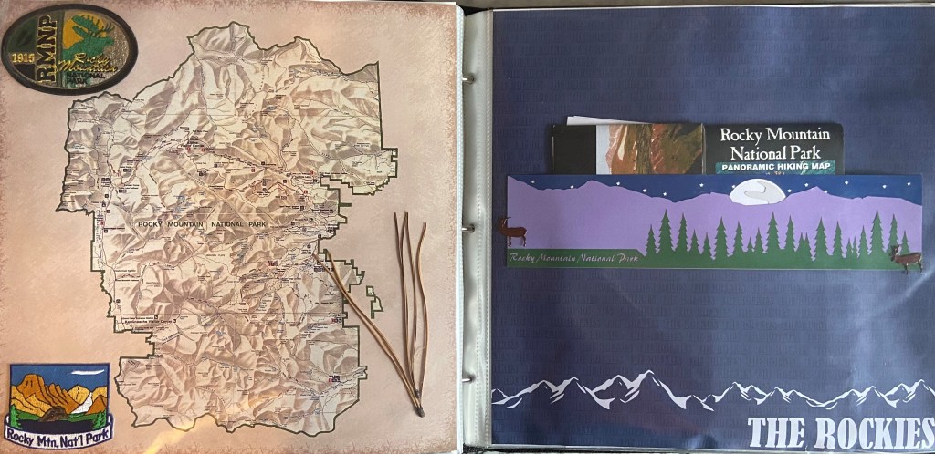 This is the last spread of our 2011 Summer trip to hike in the Rocky Mountain National Park. It contains ephemera from our trip that did not make in onto the other pages. I usually create a spread like this as the last single or double page in a vacation series.