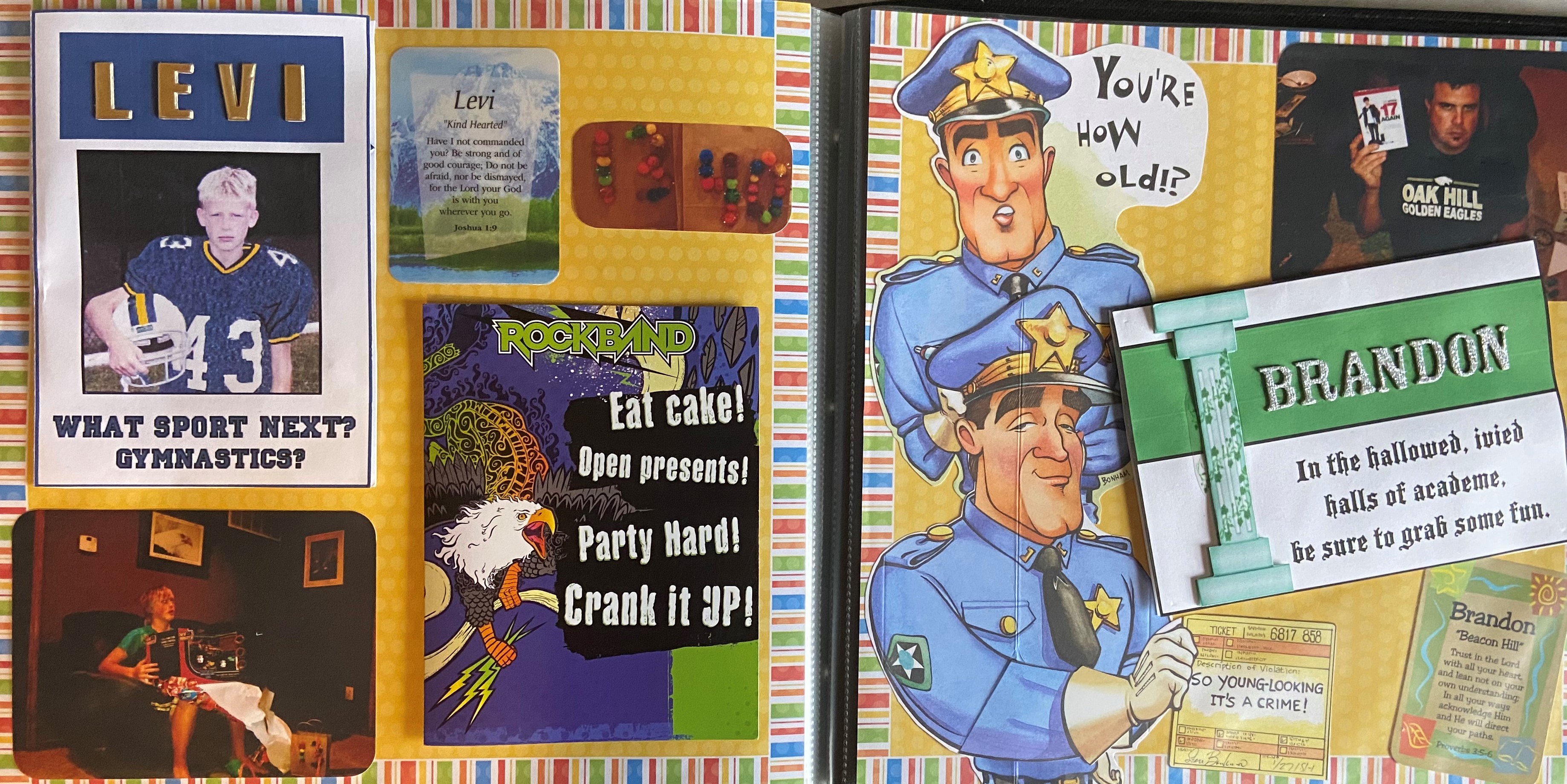 This spread has some pictures of us opening presents, but mostly showcases cards we received. Some of the cards are attached to the outside of the plastic page protectors so that they can be opened by the viewer to be read which you can see in the photograph below. Some people might think that this page looks crowded, but I like that it contains so may ephemera from the day that help us to remember it.