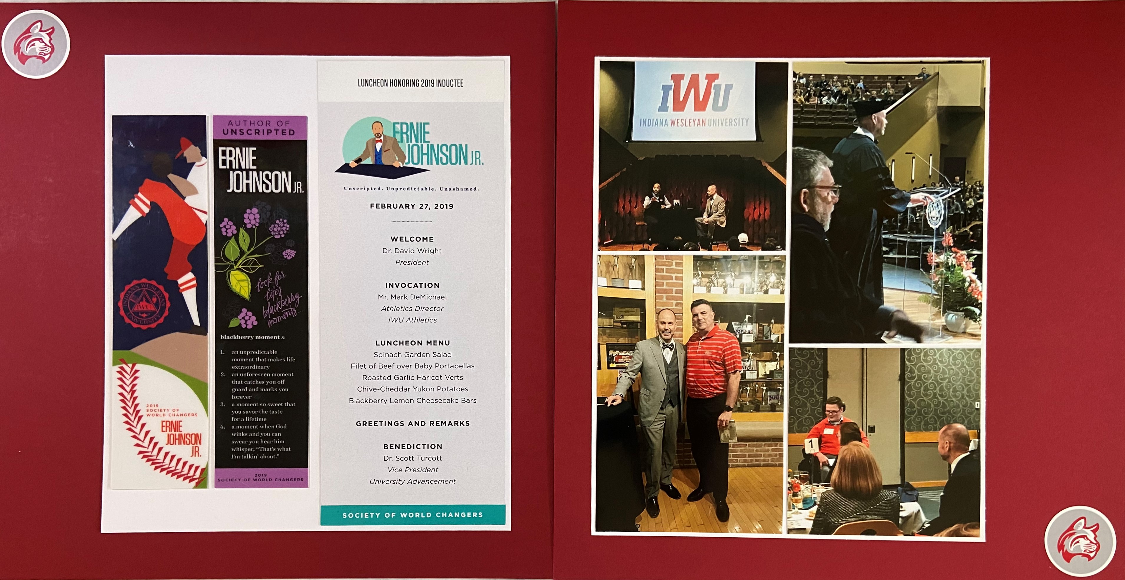 This spread honors that day and Ernie. I chose a red background paper to match the school colors, and the red in some of the pictures (including my shirt!) I bordered the ephemera and the photos in white to match the white around the institutional stickers on the page. The left-hand page has some bookmarks and the luncheon program from the day.