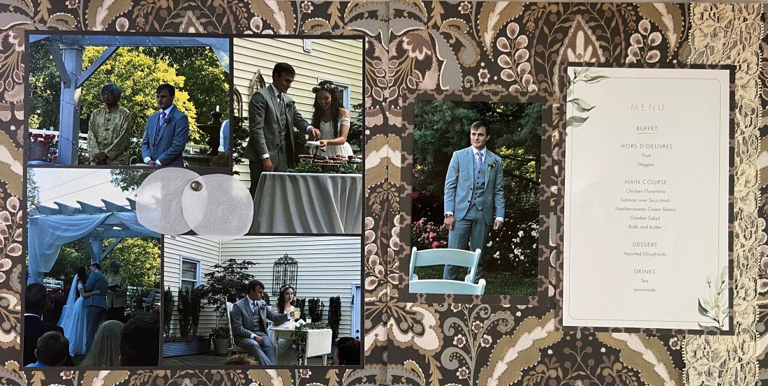 This spread has pictures from the wedding and the reception. I chose the background paper based on the menu from the reception. I bordered the 4 pictures on the left-hand page with a solid dark brown paper which helps the photos to stand out on the busy background. The white items in the middle of these photos are cloth petals that were on the tables at the reception. I used my Crop-A-Dile Big Bite Punch to punch a hole through the petals and the papers to use a brad to attach them to the page. I did this because the petals are opaque, and I did not want the adhesive tabs to show through.