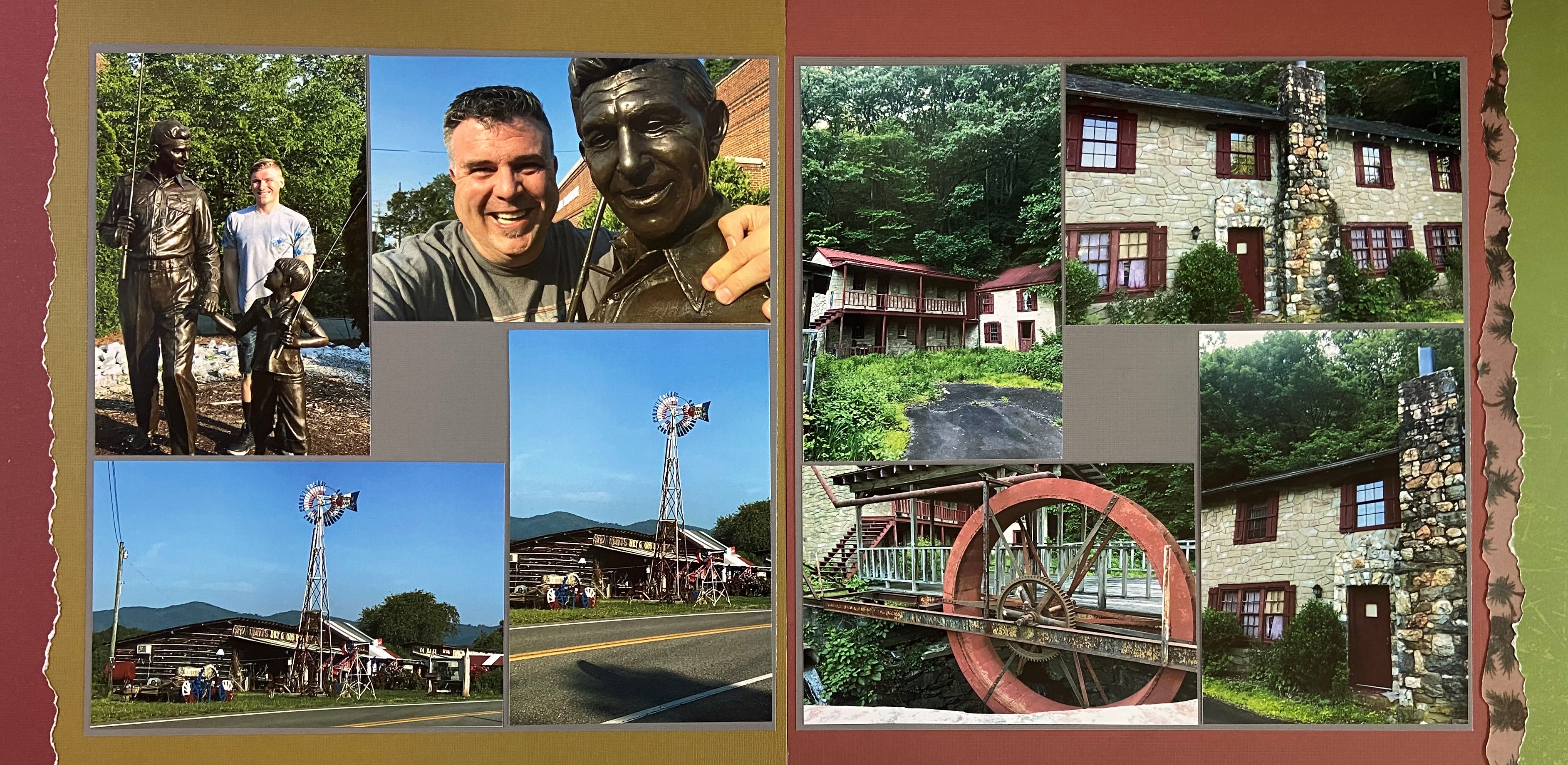 Starting on the left-hand page, the two photos on the top are from Mt Airy, NC – the birthplace of Andy Griffith, and these statues are on the grounds of Andy Griffith Playhouse. We had hoped to do more in My Airy, but it was a Sunday morning, and few things were open yet. So, we stopped by and got some pictures with Andy!