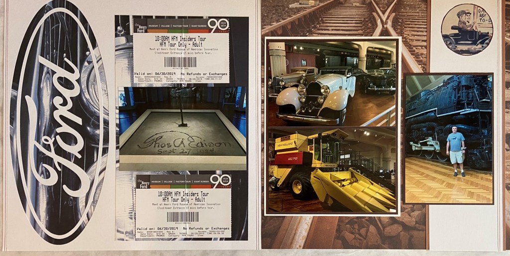 The left-hand page background is the left over from the cutout made for the previous Rouge Ford Factory page, which was then placed on top of a headlight photograph page. This continues the theme that this museum is part of the Henry Ford complex, while also highlighting the collection of automobiles and other vehicles on display at the museum. The left-hand page contains our tickets for an Insiders tour (which helps to set a date and time for this adventure), as well as the Thomas Edison signature in cement that was created for the opening of the Henry Ford Complex.