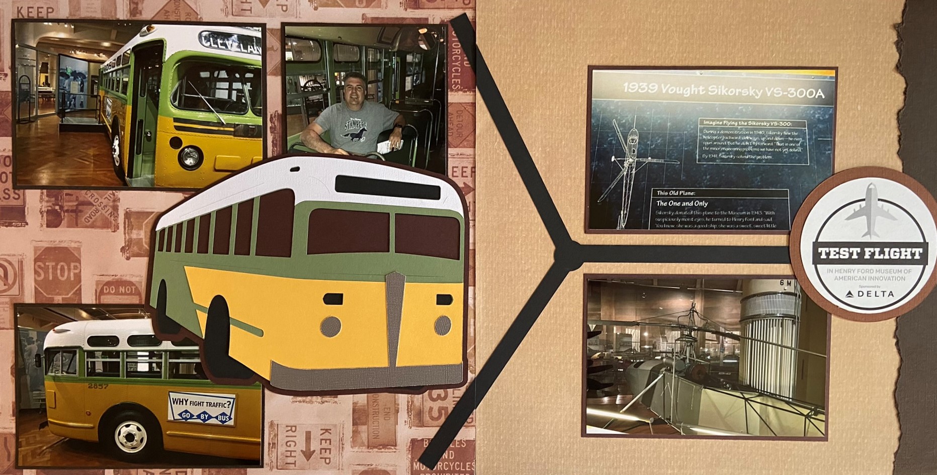 The right-hand page has pictures of the Sikorsky helicopter at the museum along with a piece of paper from a paper airplane hands-on activity that is part of that exhibit. I used Cricut Design Studio to design the black helicopter blades that extend over both pages. I used the same brown paper for the borders of the photos on this page, as well as the page border. This helps tie the two disparate themes on this spread together.