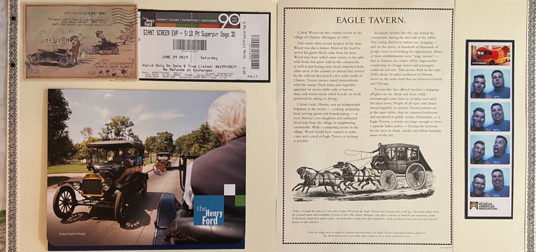 I collected a lot of ephemera on our two-day experience at the Henry Ford complex. Not all of it could fit on the previous pages that I created of this adventure, but I wanted to make sure that they were kept in the scrapbook along with the other pages. So, I created a set of pages dedicated to this collection.