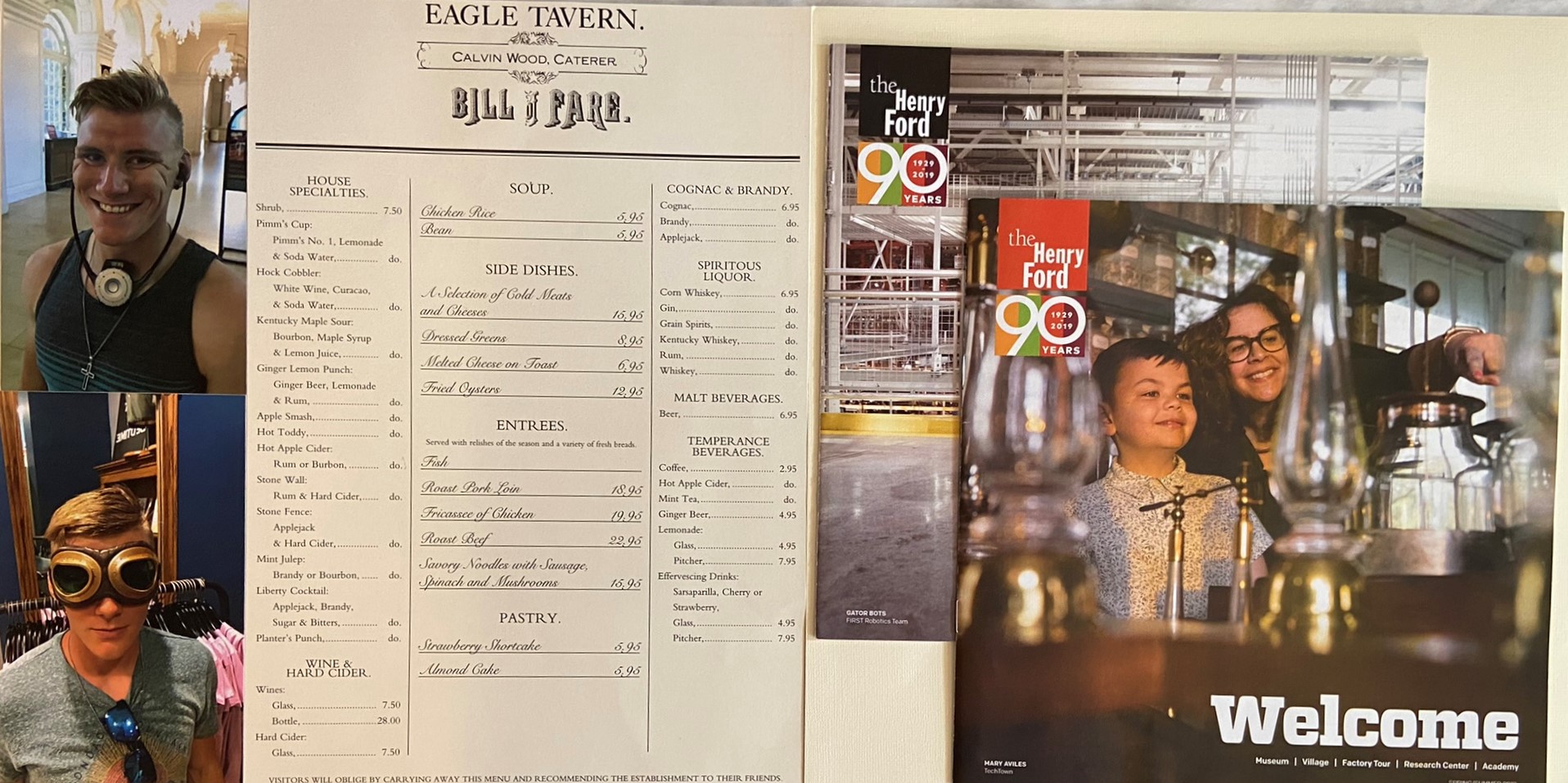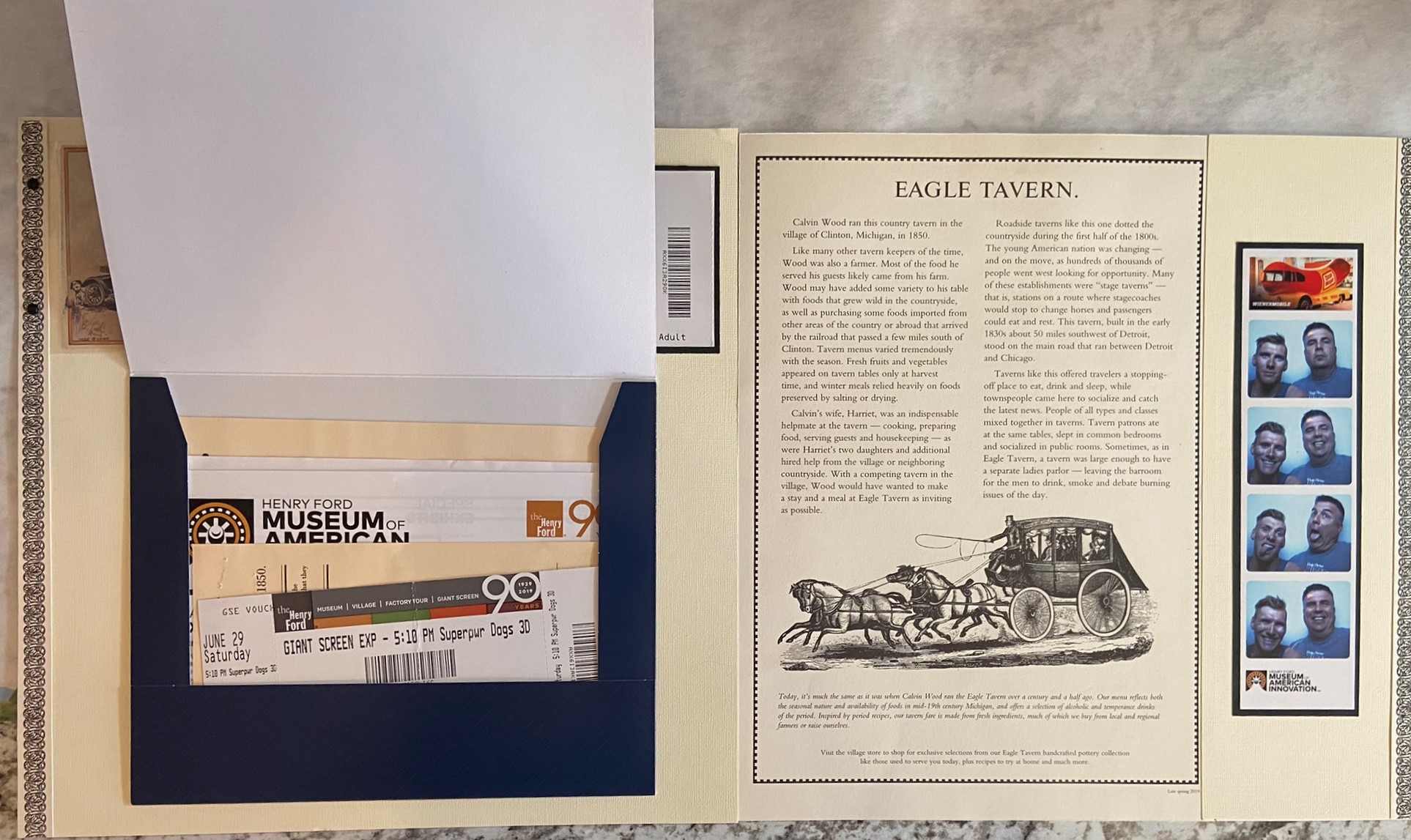 The right-hand page has a menu from the Eagle Tavern, the restaurant in Greenfield Village at which we ate lunch on the first day. The menu was double sided and fairly large. I cut it down to fit into the plastic page protector, and then added a side cardstock to fill the remaining part of the page. I put some photo booth pictures of us taken in the museum on the page as well.