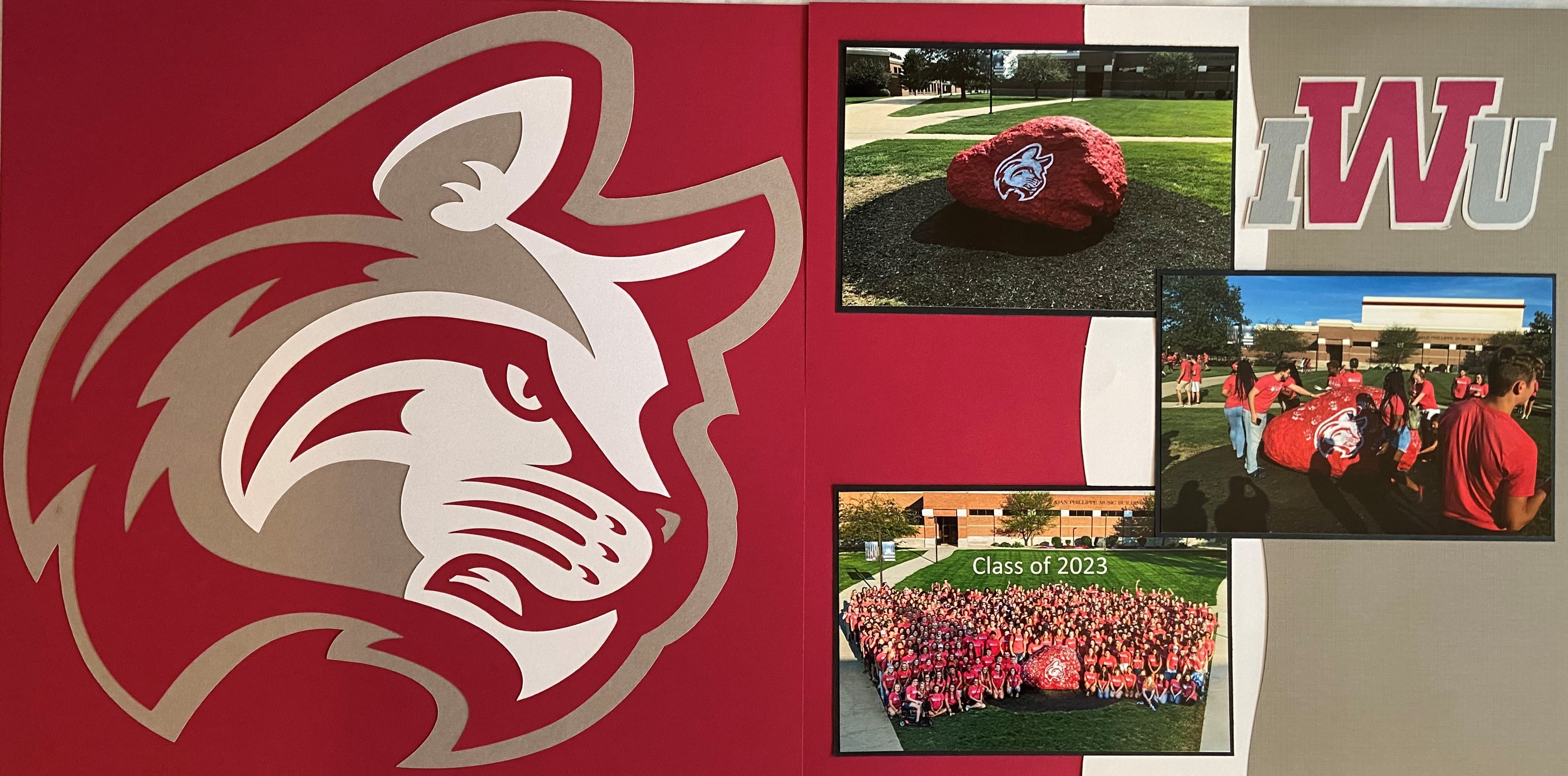 I chose a red, white, and grey theme for this page to match the colors of the pictures, the rock, and the school colors. For the lefthand page I used my Cricut Machine to cut out the school logo in large format so that it filled the whole page, as well as the smaller “IWU” that is on the righthand page.