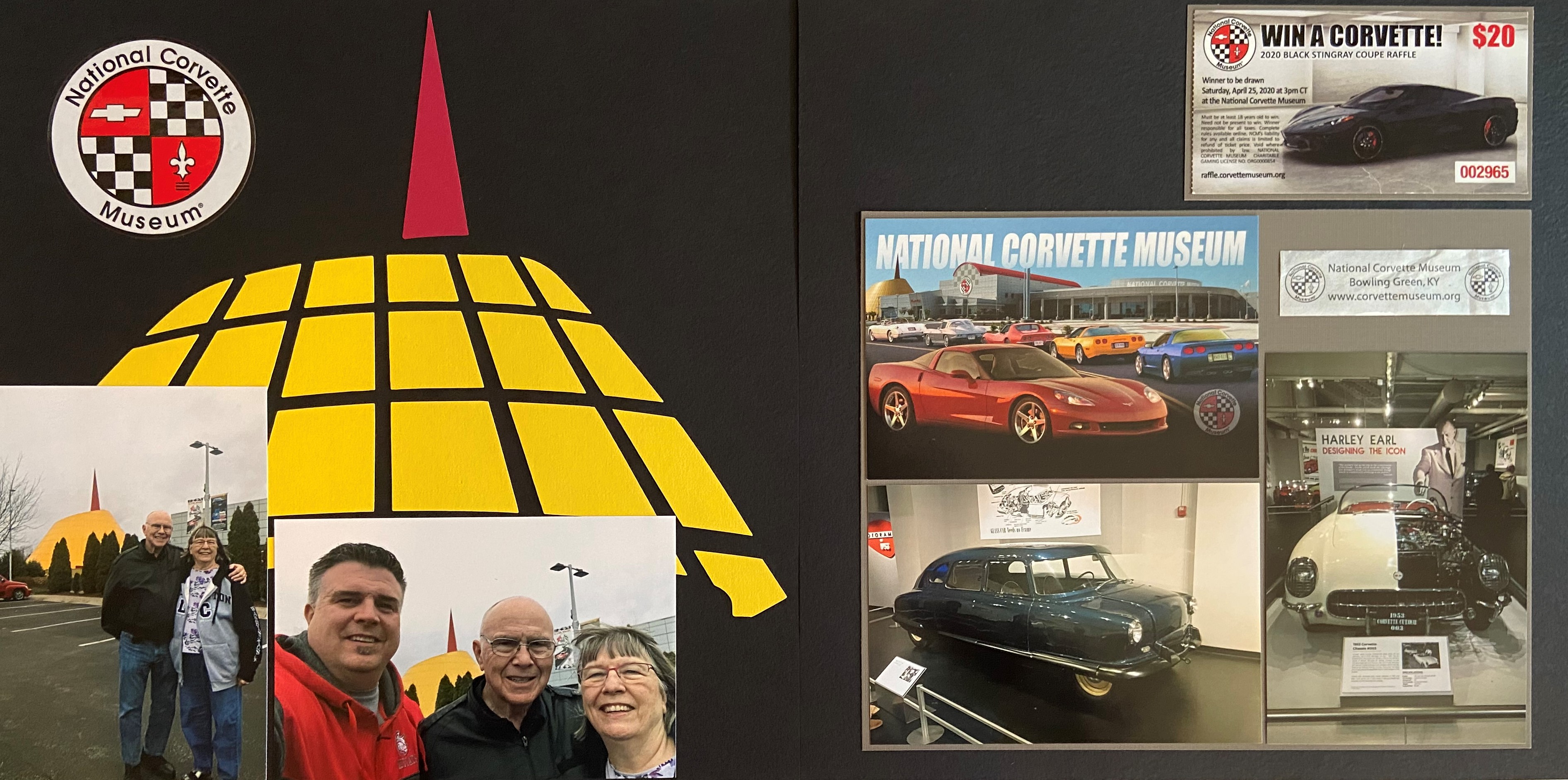 This was a fun spread to make as I create the museum design on the lefthand page. If you look at the leftmost picture you can see the design of the museum in the background which I replicated on the page. I found the design online as a SVG and then used my Cricut Machine to cut it out. Below you can see a video of how I made this background page. The lefthand page also contains a Corvette sticker that I bought in the museum store.